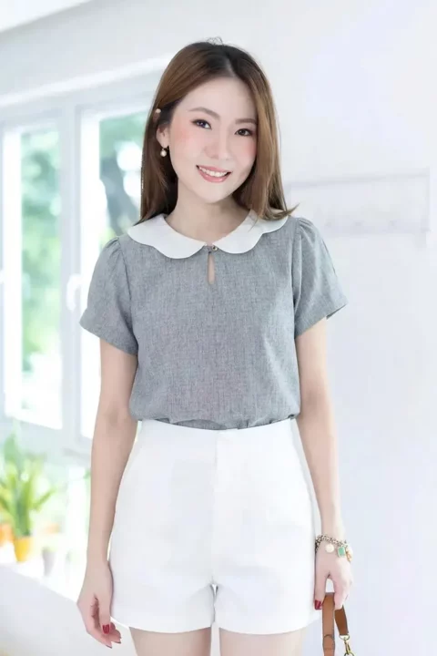 เสื้อคอปกหยักทรงกลีบดอกไม้น่าร้ากกก เจาะหยดน้ำด้านหน้าติดกระดุม แขนสั้น จับจีบที่ปลายแขนดูพองนิดๆ ใช้เนื้อผ้าโพลีเอสเตอร์ทอมีลายในตัว Texture ผ้าจะให้อารมณ์แบบลินินลายสลาฟ แต่เนื้อยับยากกว่า ผ้าเป็นทรงแต่ไม่หนามากไม่บางไป ดูแลง่าย