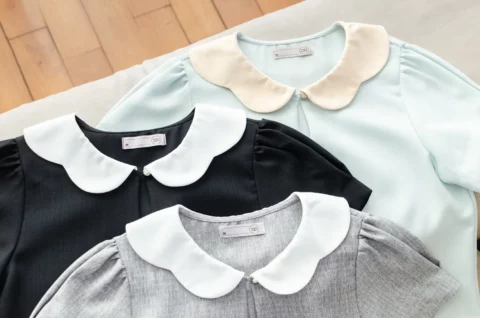 เสื้อคอปกหยักทรงกลีบดอกไม้น่าร้ากกก เจาะหยดน้ำด้านหน้าติดกระดุม แขนสั้น จับจีบที่ปลายแขนดูพองนิดๆ ใช้เนื้อผ้าโพลีเอสเตอร์ทอมีลายในตัว Texture ผ้าจะให้อารมณ์แบบลินินลายสลาฟ แต่เนื้อยับยากกว่า ผ้าเป็นทรงแต่ไม่หนามากไม่บางไป ดูแลง่าย