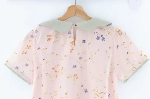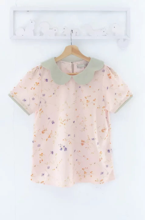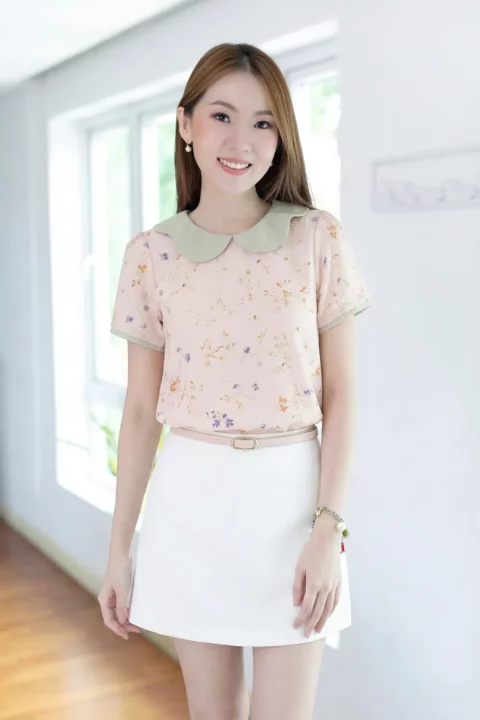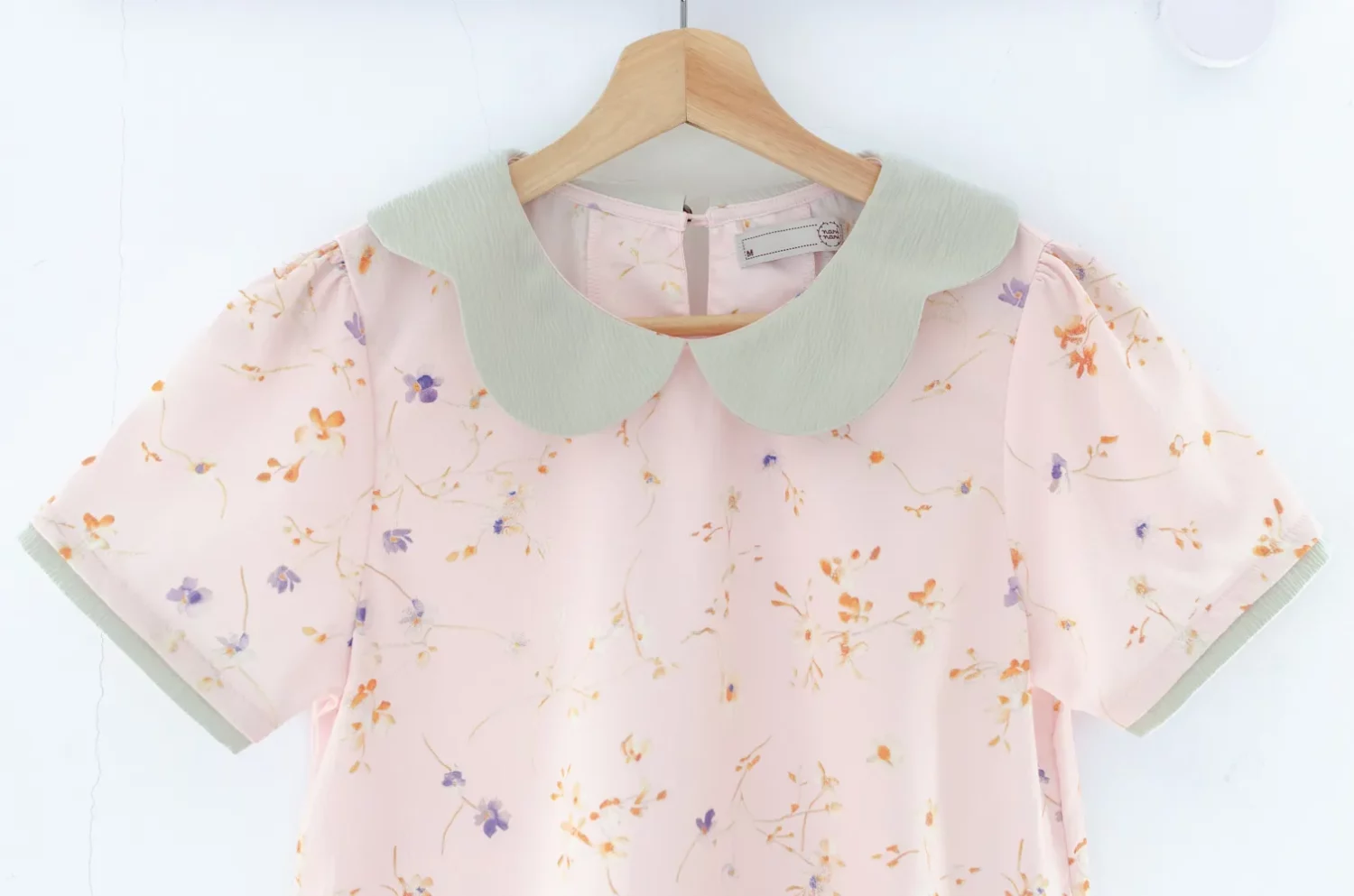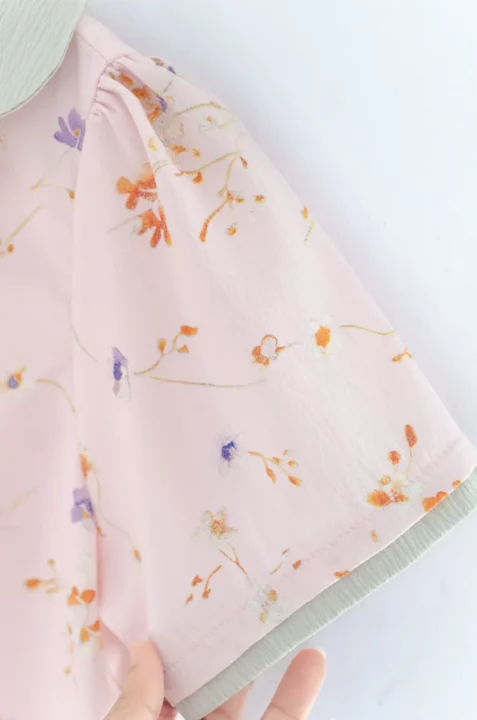 เสื้อปกโค้งหยัก แขนสั้นแต่งสีพื้นตัดกันรอบปลายแขน ด้านหลังผ่าหยดน้ำติดกระดุมคอ ทรงแมทช์ง่าย สวมใส่ง่าย ผ้าอัดลายในตัวเนื้อย่นๆ ไม่บางเกินไป พิมพ์ลายดอกไม้หวานฟุ้ง น่ารักสุดใจ