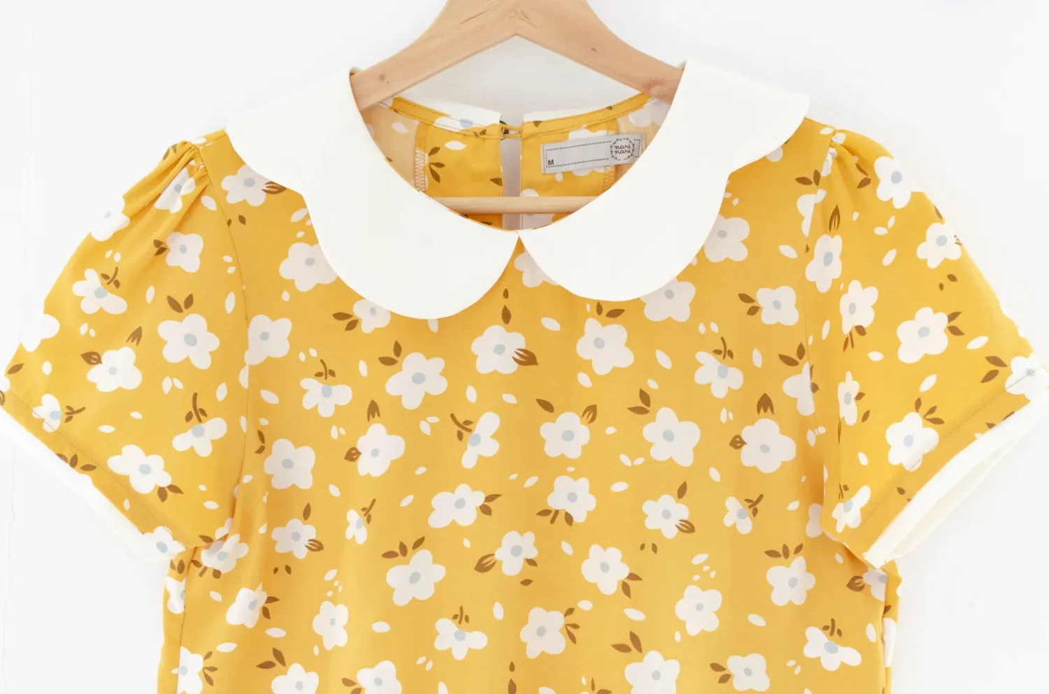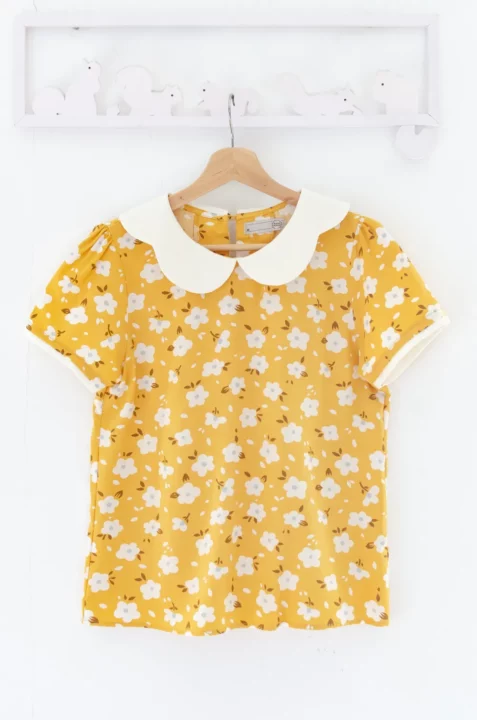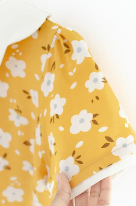 เสื้อปกโค้งหยัก แขนสั้นแต่งสีพื้นตัดกันรอบปลายแขน ด้านหลังผ่าหยดน้ำติดกระดุมคอ ทรงแมทช์ง่าย สวมใส่ง่าย เนื้อผ้าไหมอิตาลีเนียนผิว รีดง่ายดูแลยง่าย
