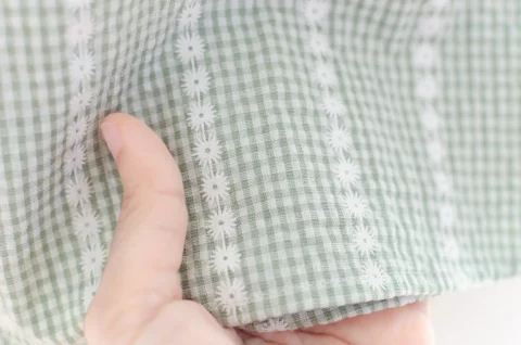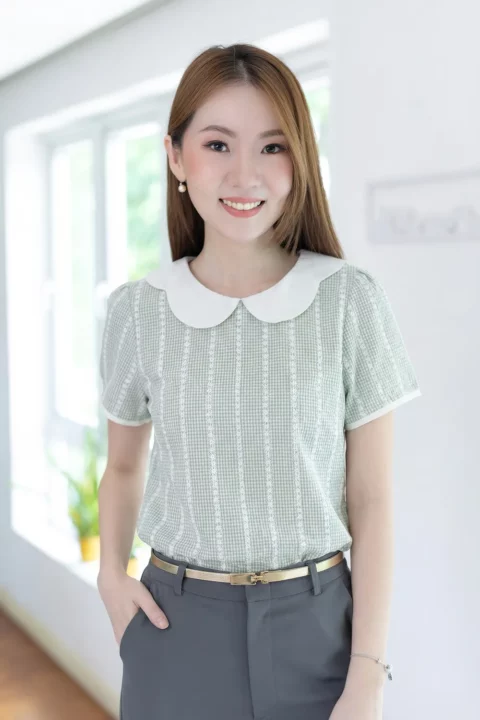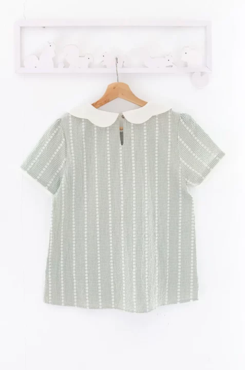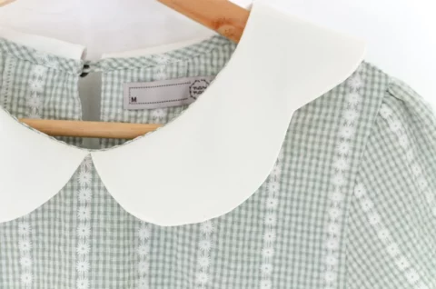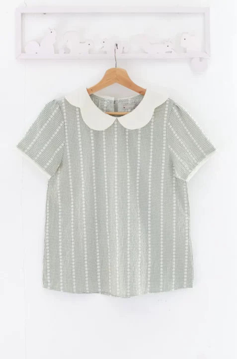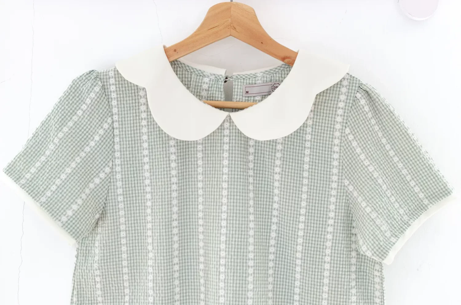 เสื้อปกโค้งหยัก แขนสั้นแต่งสีพื้นตัดกันรอบปลายแขน ด้านหลังผ่าหยดน้ำติดกระดุมคอ ทรงแมทช์ง่าย สวมใส่ง่าย เนื้อผ้าคอตตอนทอย่นนิดๆลายตาราง สกรีนลายดอกเล็กยาวเป็นริ้วบนผิวผ้า น่ารักสุดใจ