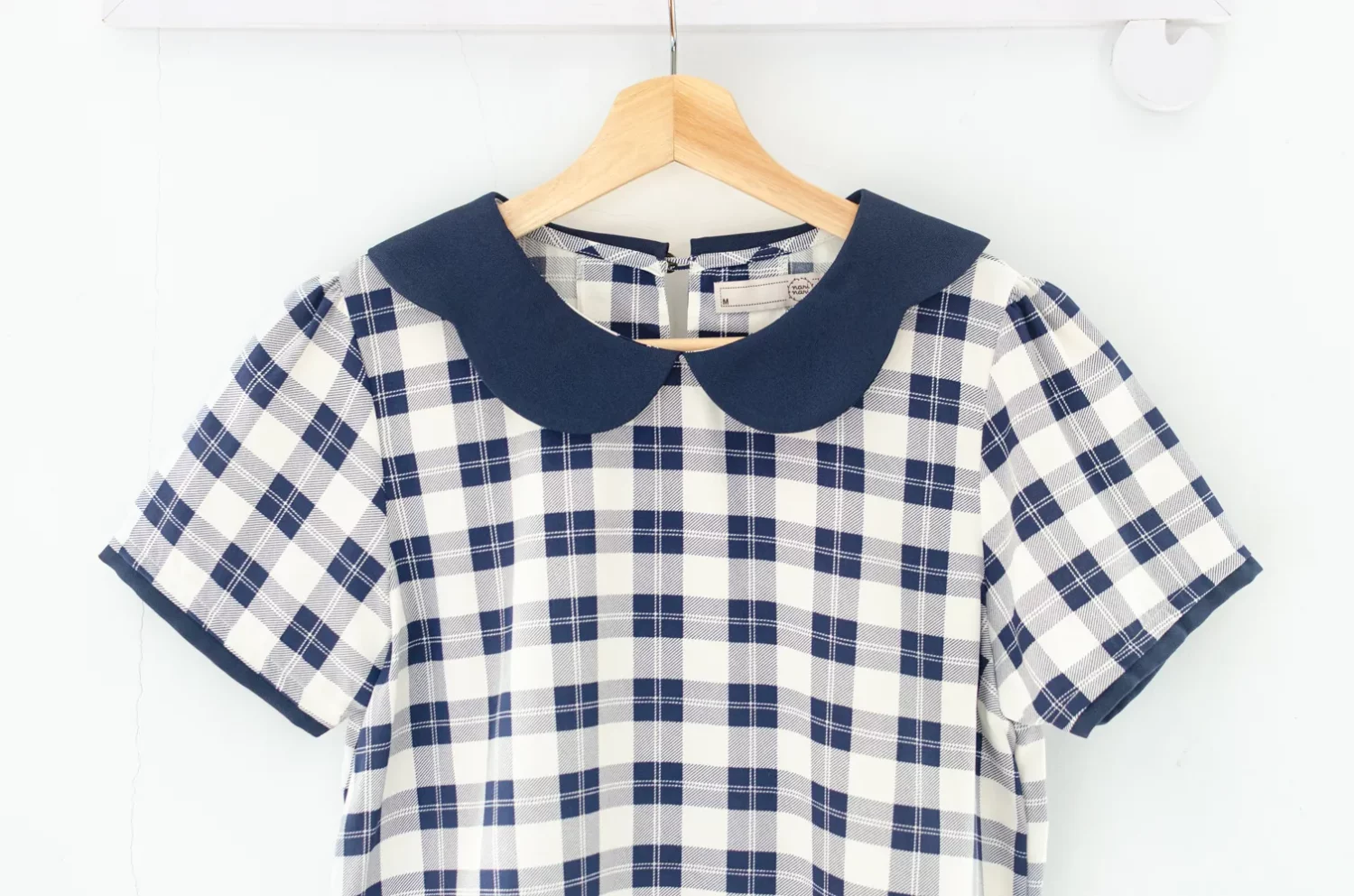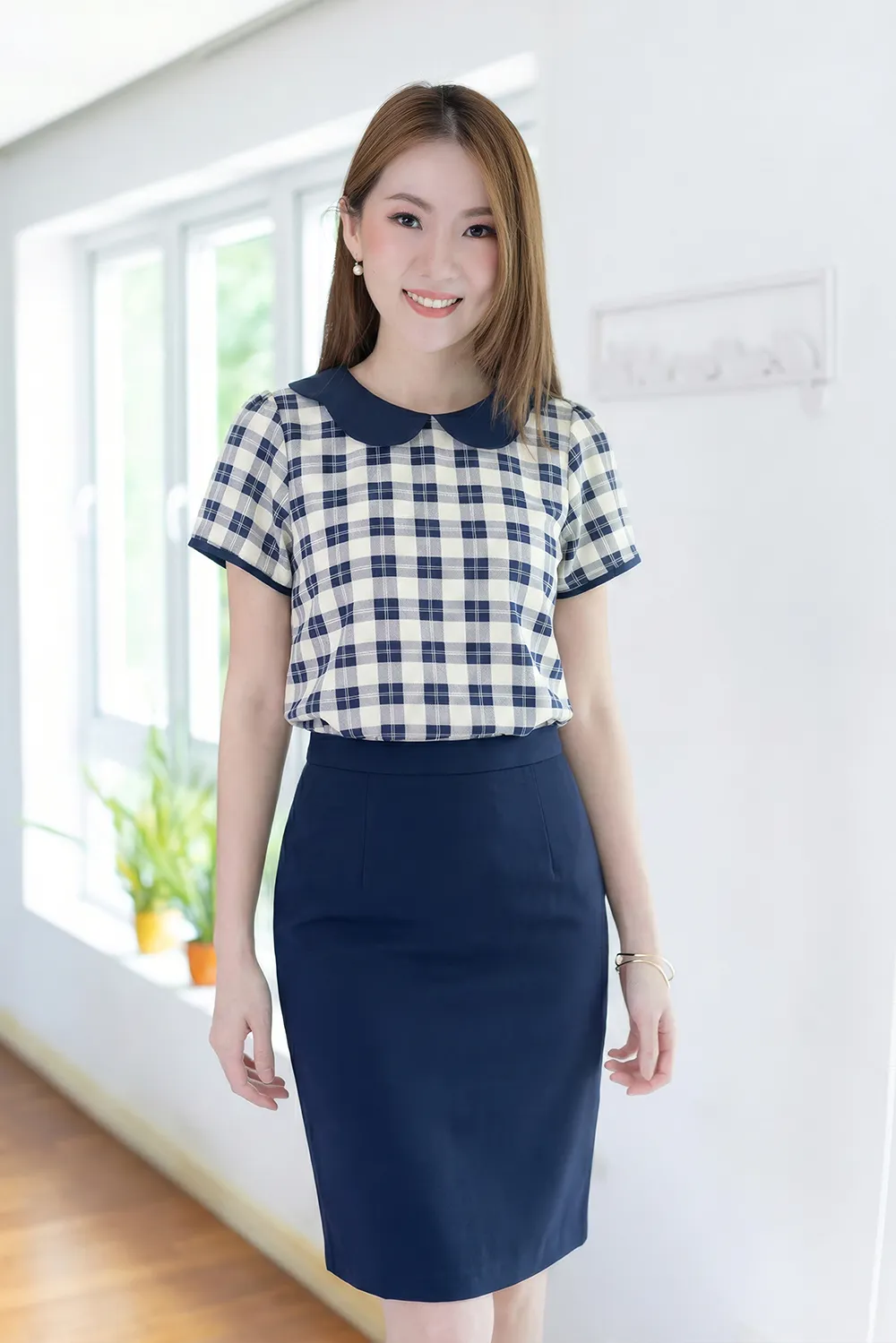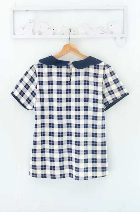 เสื้อปกโค้งหยัก แขนสั้นแต่งสีพื้นตัดกันรอบปลายแขน ด้านหลังผ่าหยดน้ำติดกระดุมคอ ทรงแมทช์ง่าย สวมใส่ง่าย เนื้อผ้าไหมอิตาลีเนียนผิว รีดง่ายดูแลยง่าย