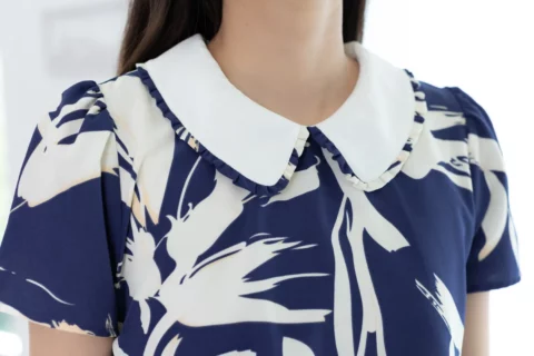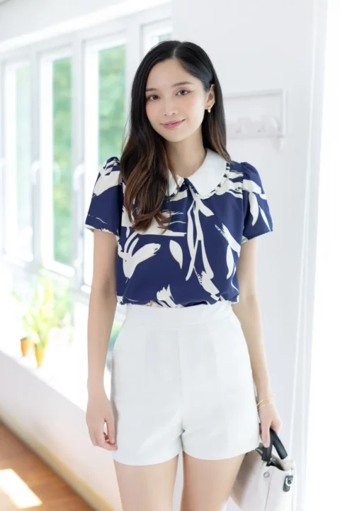 MT7101 Frill Peter Pan Collar Graphic Blouse – Blue