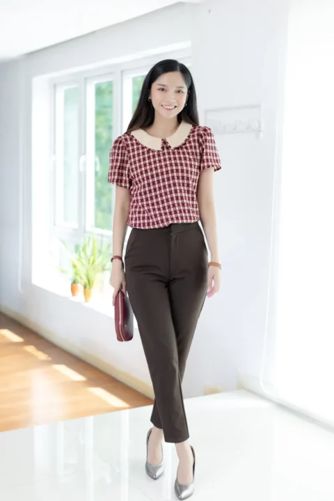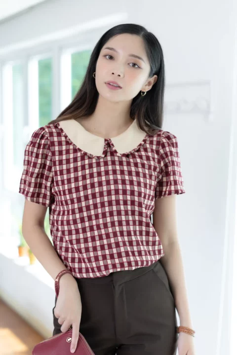 เสื้อทรงน่ารัก ปกบัวแต่งระบาย แขนสั้นจับจีบหัวไหล่เบาๆ ผ่าหยดน้ำติดกระดุมคอด้านหลัง ใส่ทำงานทรงสวย ผ้าเนื้อดี นิ่มสบาย ผ้าเนื้อพิเศษ Texture เก๋ที่สุด ตัวผ้าทอสลับสีลายตาราง ตรงเส้นตารางแดงเนื้อจะฟูๆนิ่มๆ สัมผัสดีงาม