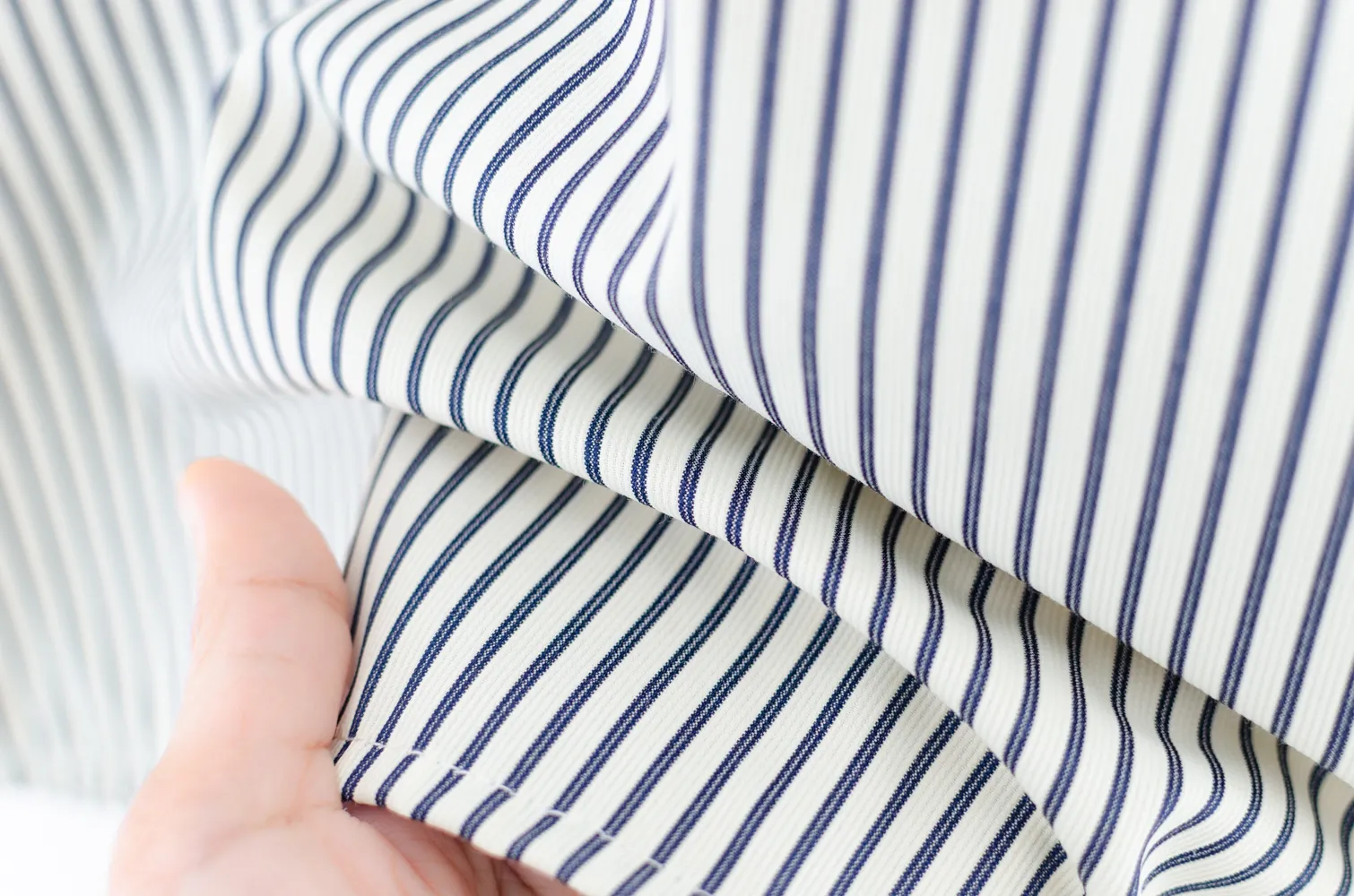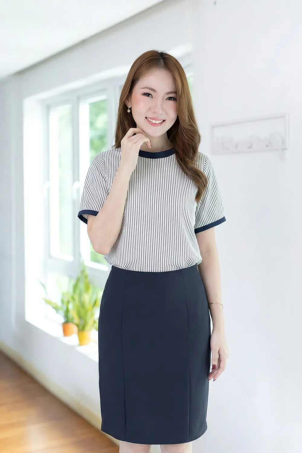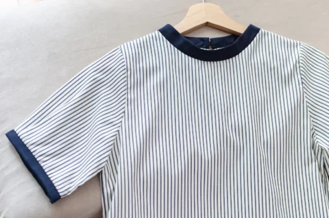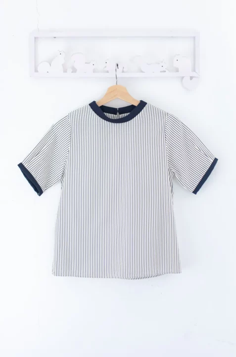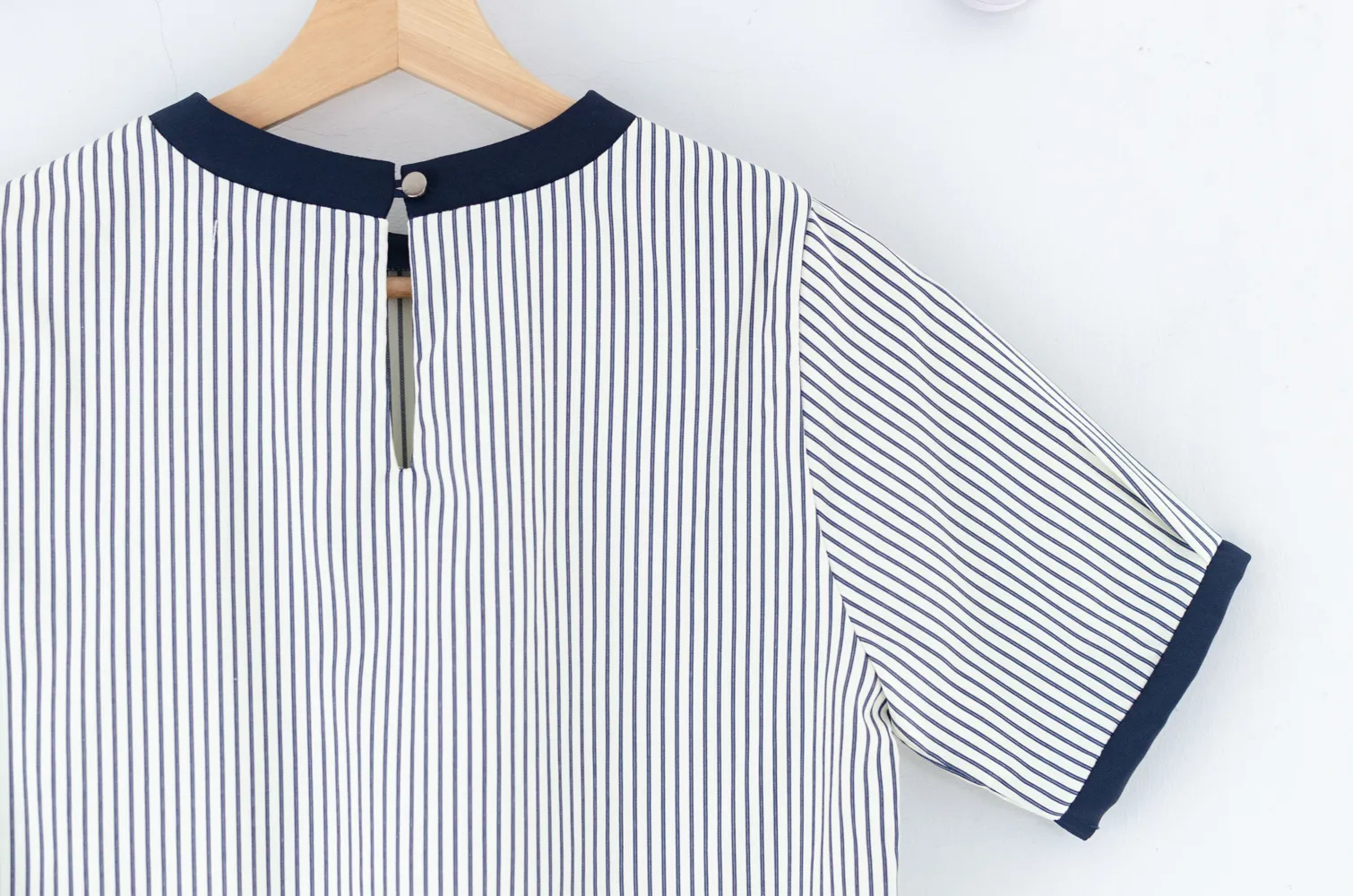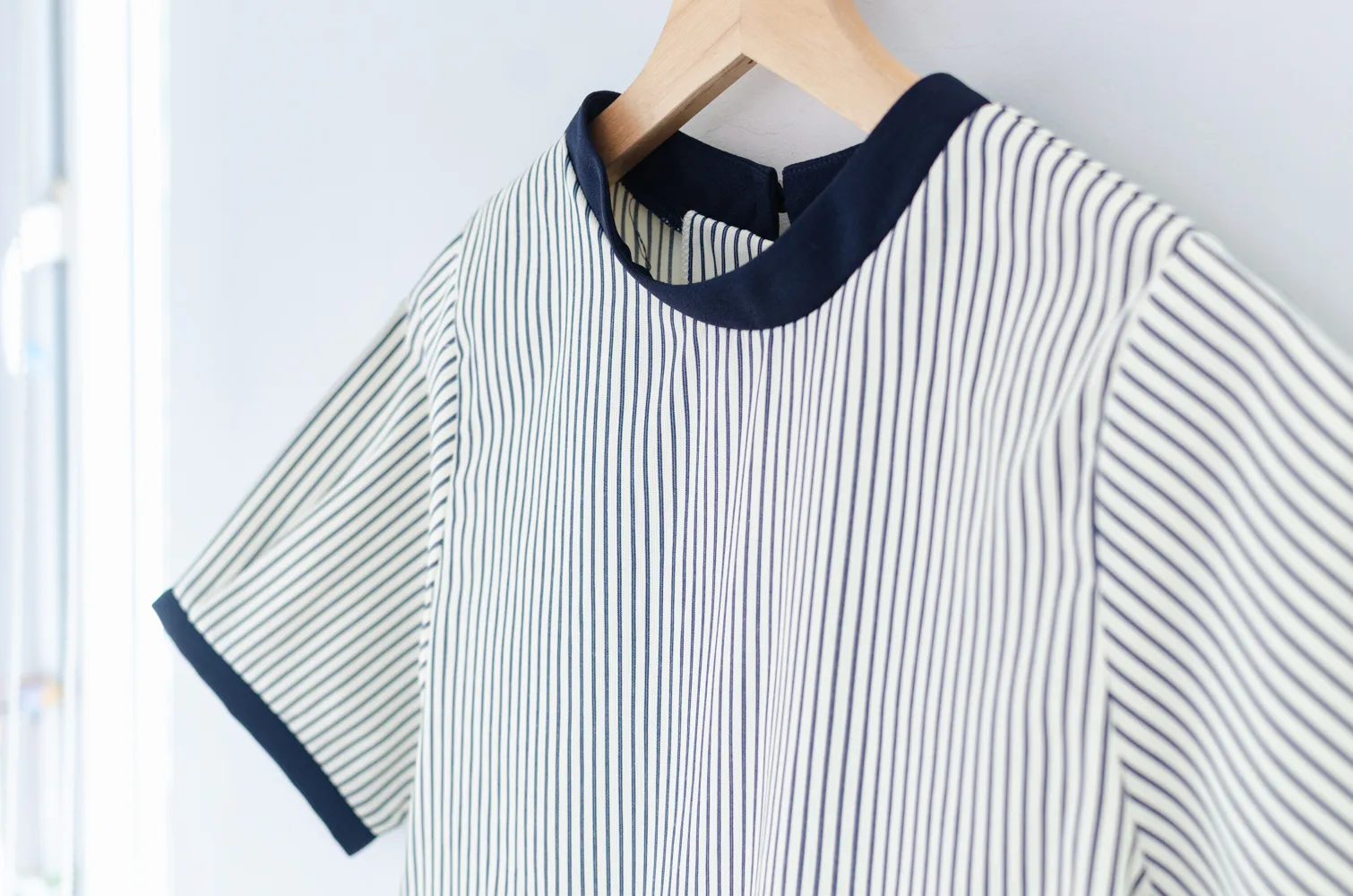 เสื้อที่มีเส้นสายเรียบๆ คอกลมคลีนๆ แขนไม่สั้นเกิน ทรงนี้ตั้งใจทำมาแบบเรียบง่ายอย่างตั้งใจ ใช้ดีเทลสีตัด ลุคที่ได้จะแมทช์เข้ากับรองเท้าและกระเป๋าได้หลากหลาย เพิ่มความสนุกในการแต่งตัวได้ง่าย แค่เปลี่ยนแอ็กเซสซอรี ก็ได้ลุคใหม่ทันที ลายนี้เป็นผ้าโพลีเอสเตอร์ผสม มีลายทอลายริ้วในตัว