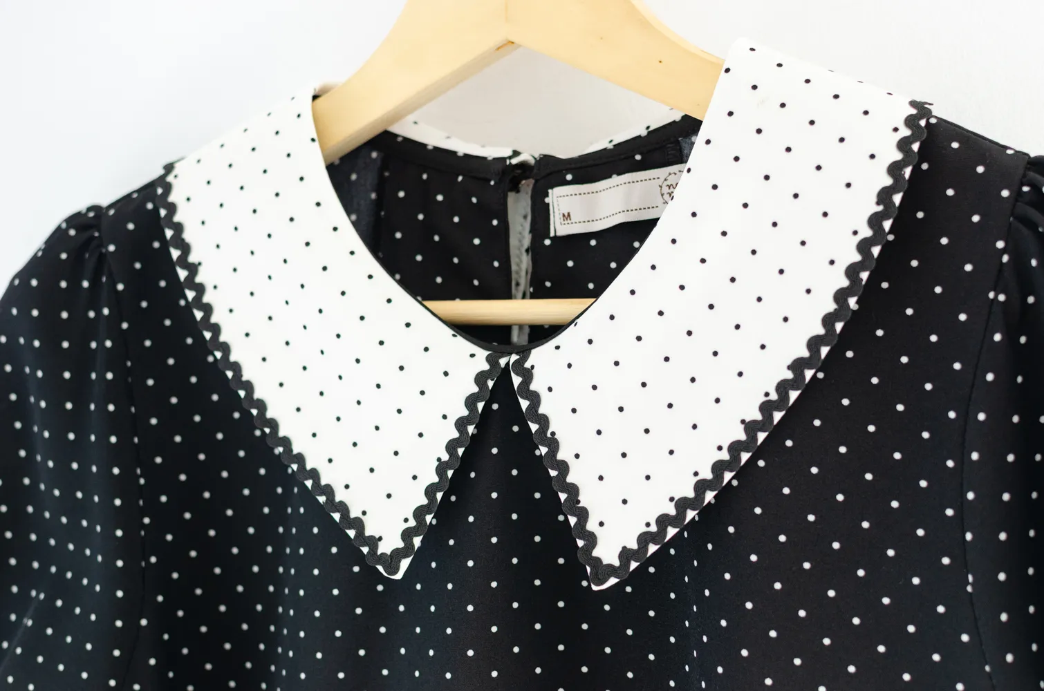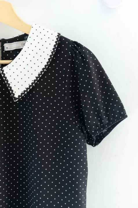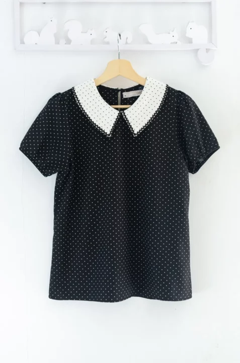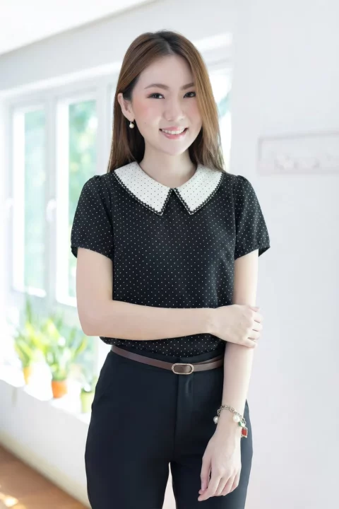 เสื้อเรียบร้อยและน่ารักเข้ามารัวๆแบบไม่ให้พัก! รุ่นนี้ปกบัวตัดปลายแหลม สุภาพ แมทช์ง่ายเช่นเคย รอบๆปกตกแต่งด้วยแถบลูกไม้หยักเลือกสีตัดกัน แขนสั้นจั๊มปลายยางยืดเพิ่มความน่ารักขึ้นอีก 1 Level 🌟