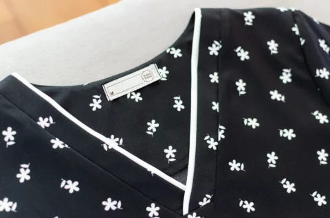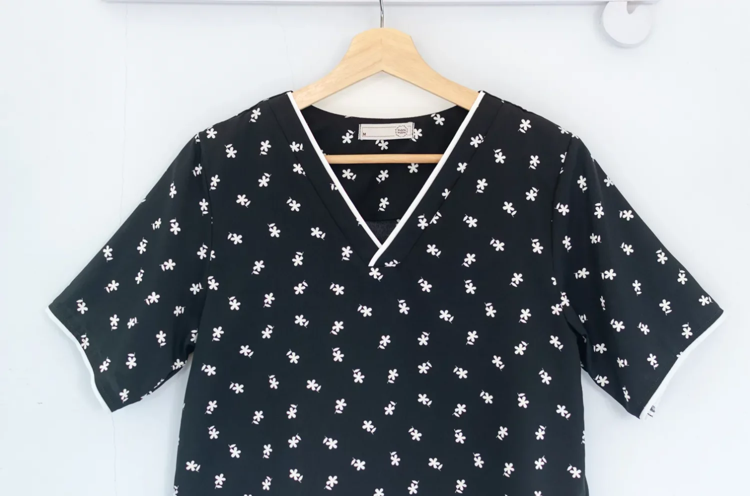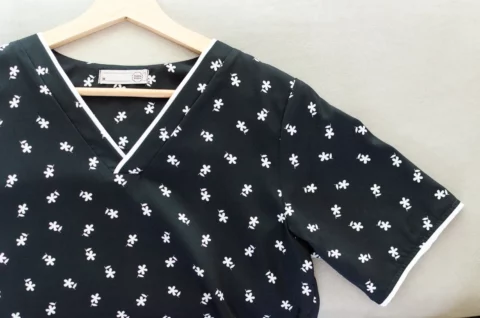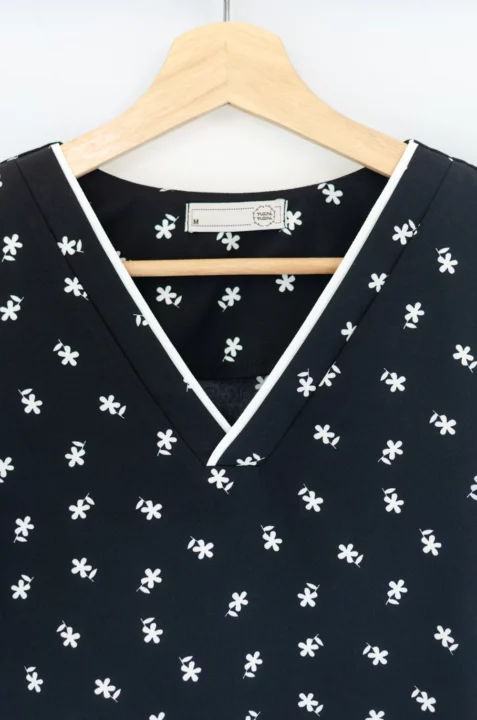 เสื้อคอวีทรงคลาสสิก หลวมๆปล่อยๆ ขอบคอซ้อนมาจบกันตรงกลาง แขนไม่สั้นมาก เสื้อเป็นแบบสวมไม่มีผ่าหลัง ตัดเย็บด้วยผ้าเนื้อเนียนลื่น แห้งไว ใส่ง่าย ดูแลง่าย