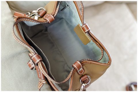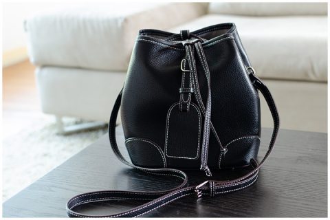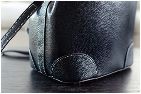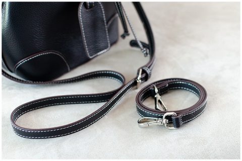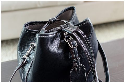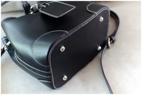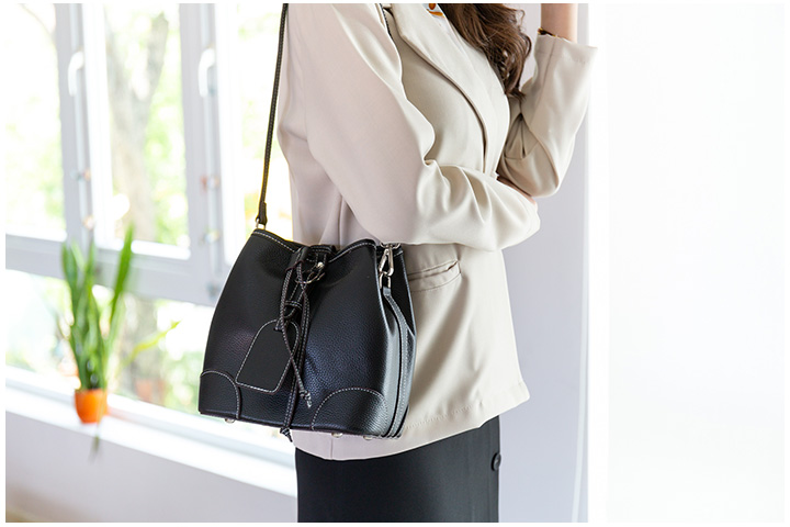 กระเป๋าหนังทรงถัง มาพร้อมกับสายสะพายไหล่ และสายสะพายข้างปรับความยาวได้ ตัวกระเป๋าสีดำ สีคลาสสิคตลอดกาล ซับในด้วยผ้าทอลาย Herringbone ด้านในมีช่องซิปและช่องใส่ของเล็กๆ อีก 1 ช่อง ด้านบนเป็นสายรูดรอบขอบกระเป๋าตกแต่งแท็กห้อยด้านหน้า ฐานกระเป๋าทรงสี่เหลี่ยมผืนผ้าแข็งแรงอยู่ทรงสามารถวางได้โดยที่ของด้านในไม่หล่นออกมา แมทช์กับชุดไหนก็ดูเก๋และเท่ห์ขึ้น ขนาดกำลังดีเลย