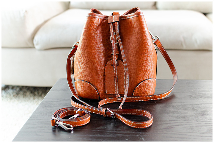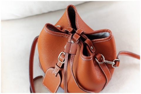 กระเป๋าหนังทรงถัง มาพร้อมกับสายสะพายไหล่ และสายสะพายข้างปรับความยาวได้ ตัวกระเป๋าสีส้มเข้มๆ โทนสีสวยแพงมากๆ ซับในด้วยผ้าทอลาย Herringbone ด้านในมีช่องซิปและช่องใส่ของเล็กๆ อีก 1 ช่อง ด้านบนเป็นสายรูดรอบขอบกระเป๋าตกแต่งแท็กห้อยด้านหน้า ฐานกระเป๋าทรงสี่เหลี่ยมผืนผ้าแข็งแรงอยู่ทรงสามารถวางได้โดยที่ของด้านในไม่หล่นออกมา แมทช์กับชุดไหนก็ดูเก๋และเท่ห์ขึ้น ขนาดกำลังดีเลย