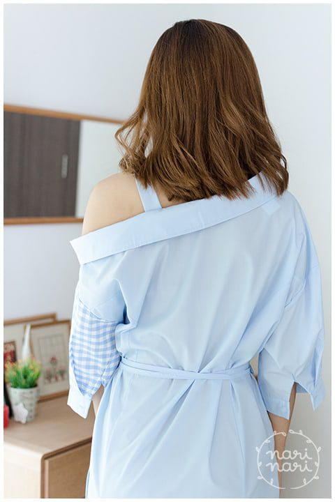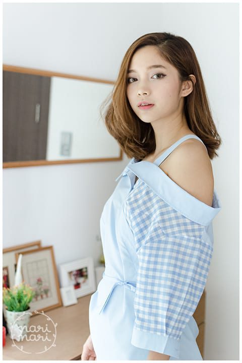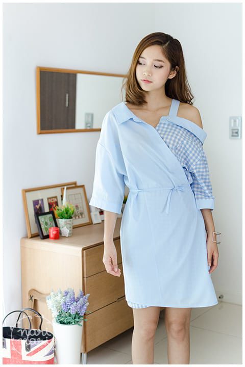 เดรสเชิ้ตแบบเก๋ๆ คอปก แต่งสายคาดไหล่ 1 ข้าง มีสายเชือกไว้พันรอบตัว เพิ่มลูกเล่นด้วยการตัดต่อผ้าพื้นสีฟ้าอ่อนเข้ากับผ้าลายตารางสีโทนเดียวกัน ดูชิคมากๆ ค่า