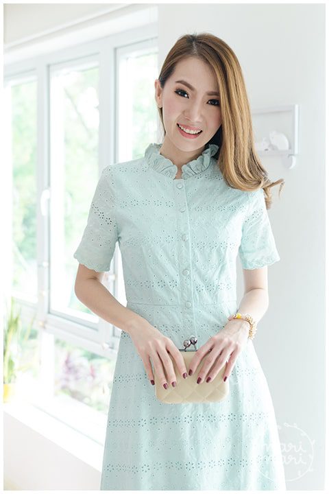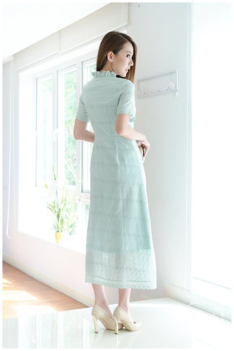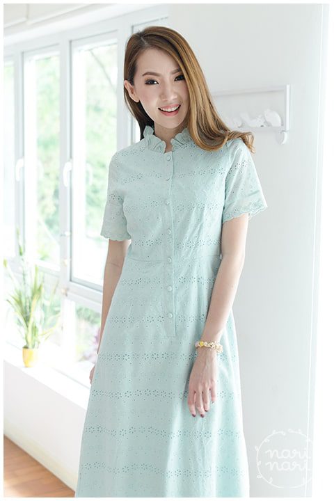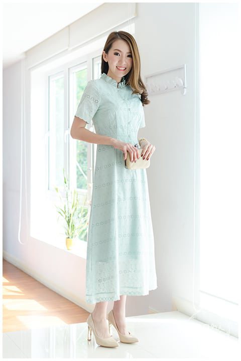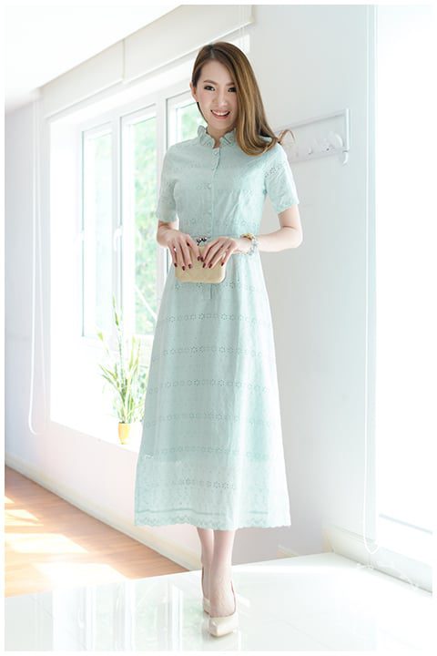 แม็กซี่เดรสยาว ผ้าคอตตอนฉลุ เนื้อดี ลายฉลุปักดอกสวยมาก สีมินท์พาสเทลหวานๆ ผ่ากระดุมยาวด้านหน้าถึงช่วงสะโพก ติดกระดุมปั๊ม คอจีบตั้งๆ แขนสั้น ใส่ง่าย ต่อขอบแขนด้วยลูกไม้ฉลุ เอวฟิกซ์ กระโปรงทรงเอ ต่อลูกไม้ฉลุรอบชายเดรส สวยหวานมาก มีซับในยาวเต็มตัว ใส่ออกงานได้งามๆ เลยค่า