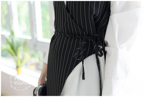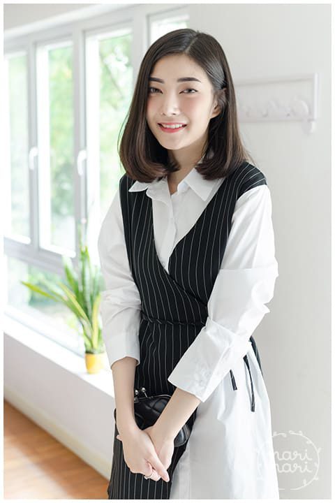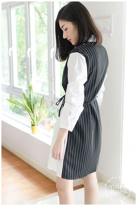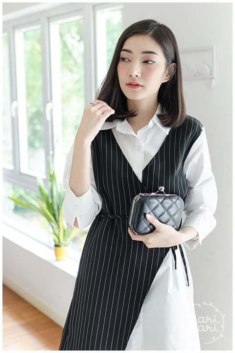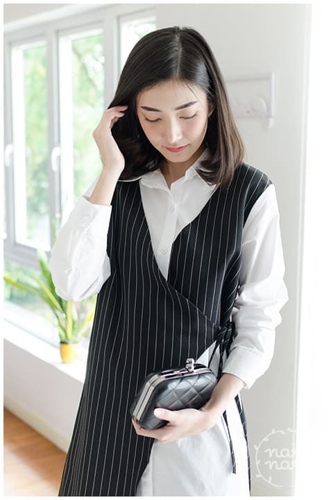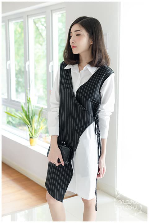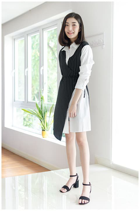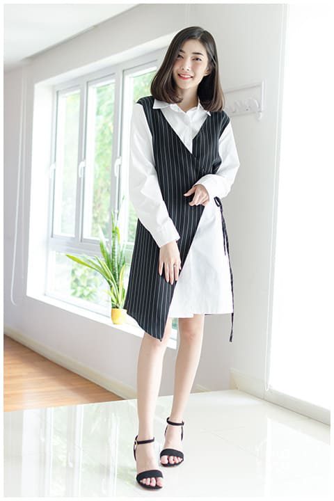 เดรสรุ่นนี้เก๋มากค่ะ เป็นเชิ้ตตัวยาว สีขาว คอปก ผ่ากระดุมหน้า แขนยาว ตัดแต่งกับผ้าสีดำลายริ้วเล็กๆ พันรอบครึ่งตัว มีสายเชือกยาวไว้พันรอบเอว หรือจะผูกข้างก็ได้ เก๋ ดูดีค่า