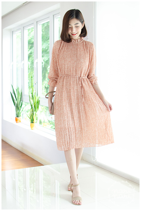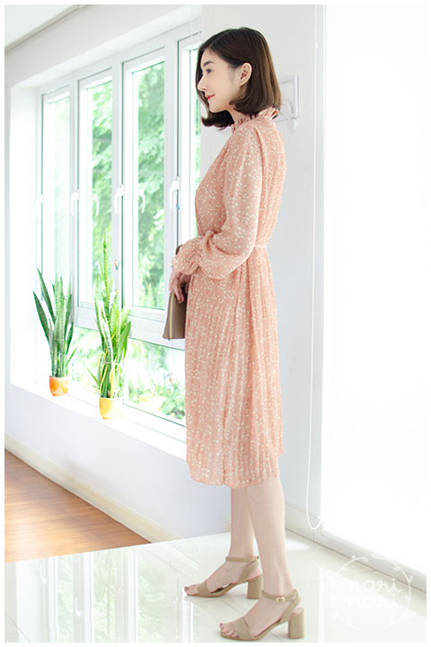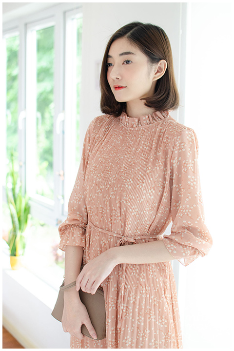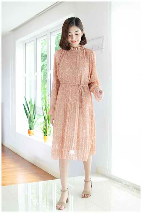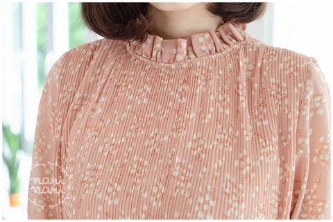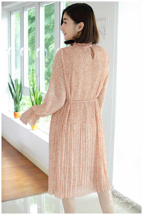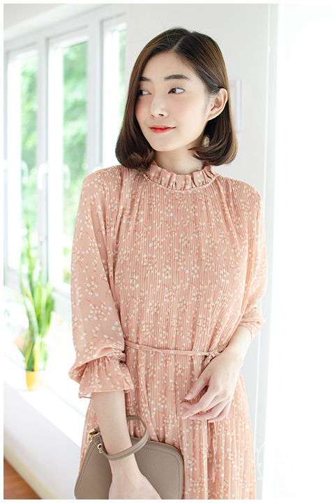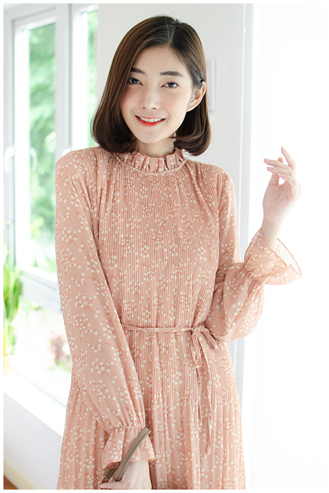 เดรสผ้าชีฟองลายดอกเล็กๆสีขาว อัดพลีททั้งตัว คอจีบตั้งๆ ด้านหลังผ่าหยดน้ำติดกระดุม แขนยาวจัมพ์เบาๆ ปลายบานเล็กน้อย ดูหวานละมุน ช่วงบนอัดพลีทถี่ๆ ช่วงล่างอัดพลีทแบบหลวมๆ มีซับในทั้งตัว มีสายคาดเอวให้ด้วย สวยหวานค่า