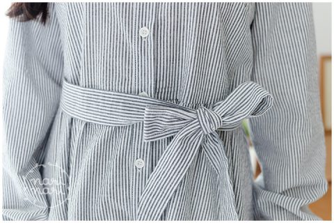 เดรสคอตตอนลายริ้ว คอปก ผ่าหน้ายาว ให้มู้ดน่ารักๆ ช่วงเอวแต่งจีบระบาย ปลายแขนแต่งสายไว้รูดผูกเป็นโบว์ เนื้อไม่หนามาก ทรงใส่ง่าย ใส่ไปไหนก็สวยยย