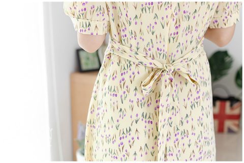 เดรสสีเหลืองอ่อน พิมพ์ลายดอกไม้สีม่วง ทรงสบาย แขนสั้น แอบพองนิดๆ คอกลม ช่วงเอวมีสายยาวเย็บฟิกซ์ไว้ผูกเป็นโบว์ มีซับในช่วงล่าง ผ่าซิปซ่อนด้านหลัง ใส่ง่ายสไตล์วินเทจสุดๆค่า รุ่นนี้มีสายสั้นไว้สำหรับผูกผมเนื้อเดียวกันมาให้ด้วยค่ะ ^^ ละมุนมากก