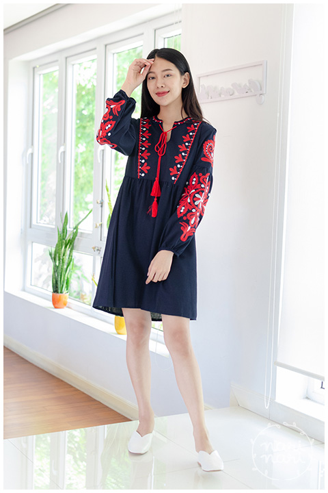 เดรสสั้นมู้ดสดใส ใช้ผ้าคอตตอนสีพื้น ทรงคอจีน ผ่าคอวีสั้นๆ ต่อเชือกปลายพู่ไว้ผูกเป็นโบว์ ส่วนแขนก็เพิ่มดีเทลด้วยการต่อแขนยาวจับจีบพองๆ ดูเป็นทรงบอลลูน ปักลายแน่นๆรอบคอ ด้านหน้า และช่วงแขน ใส่แล้วได้อารมณ์ชิลๆเลย