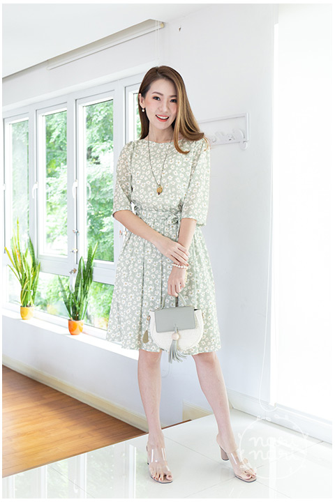 เดรสสวยแบบสดใสๆ ผ้าชีน่าเนื้อนิ่ม สีเขียวอ่อนพิมพ์ลายดอกไม้ ทรงสบายๆ คอปาด แขนทรงกระบอก ยาวประมาณข้อศอก ช่วงเอวเป็นยางยืด มาพร้อมกับสายคาดเอวไว้ผูกเป็นโบว์ กระโปรงจีบทวิส ผ้ามีน้ำหนัก ทิ้งตัวดี รีดง่าย ความยาวกระโปรงไม่สั้นเกินไป มีซับในเต็มตัวเลยค่า