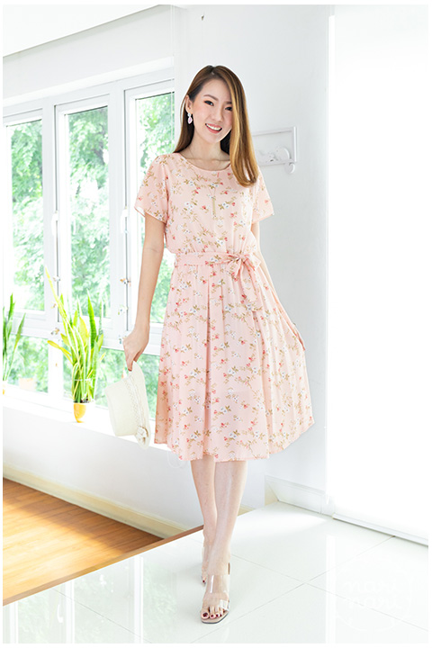 เดรสผ้าชีน่า เนื้อผ้าคุณภาพดีมีน้ำหนักทิ้งตัว งานตัดเย็บเรียบร้อยเหมือนเดิมค่า ^^ รีดง่ายด้วยนะคะ ลายใหม่เป็นลายดอกไม้เล็กๆสีขาวและชมพูบนพื้นสีชมพูอ่อนเจือส้มจางๆ คอปาดด้านหน้า ด้านหลังเป็นคอวีแบบไม่ลึก ช่วงเอวเป็นยางยืดเบาๆ มาพร้อมกับสายคาดเอวไว้ผูกเป็นโบว์ กระโปรงจีบทวิส ความยาวกระโปรงไม่สั้นเกินไป มีซับในเต็มตัว รุ่นนี้เป็นแบบสวม เนื้อผ้าดีมากนิ่มเย็นสบายผิว ใส่ง่ายค่ะ