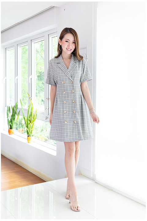 เดรสลายตารางสีเทาอมน้ำเงินตัดเส้นด้วยสีเหลืองอ่อน แขนสั้น ผ่ากระดุมหน้า แต่งกระดุมหลอกอีกแถวล้อกันเป็นกระดุมคู่ ช่วงเอวตีเกล็ดเข้ารูปแบบหลวมๆ ใส่เป็นทรง Oversized ทรงปล่อยๆ เก๋ๆเท่ๆ