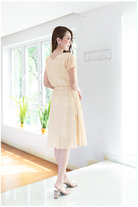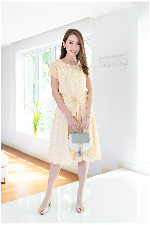 เดรสผ้าชีน่าเนื้อดี๊ดีนิ่มเย็นสบายผิว พิมพ์ลายดอกไม้เล็ก คอปาดด้านหน้า ด้านหลังเป็นคอวีแบบไม่ลึก ช่วงเอวเป็นยางยืดเบาๆ มาพร้อมกับสายคาดเอวไว้ผูกเป็นโบว์ กระโปรงจีบทวิส ความยาวกระโปรงไม่สั้นเกินไป มีซับในเต็มตัว รุ่นนี้เป็นแบบสวม