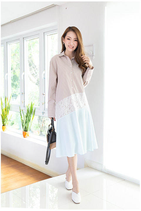 เดรสเชิ้ตผ้าคอตตอนเนื้อเนียน ทรงยาวสวย Classy มีกิมมิค คอปกเชิ้ตผ่ากระดุมหน้ายาวลงมาถึงประมาณเอว ต่อผ้าลูกไม้เพิ่มเป็นแนวเฉียง แถบข้อมือกว้างกว่าปกติดูเก๋ ติดกระดุมปลายแขน ชายเดรสจะค่อยๆบานออกทีละนิดตั้งแต่ช่วงสะโพกลงมา สวยงามทรงคุณค่ามากค่ะ