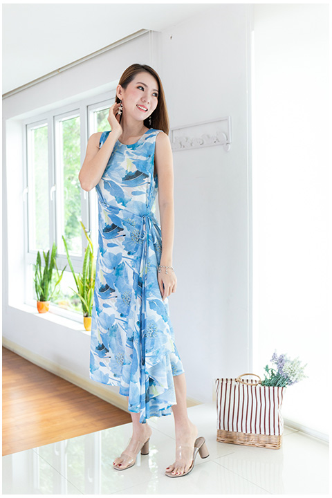 เดรสที่เห็นแล้วสดชื่น ด้วยลายพิมพ์ดอกไม้สีสวย ลายเส้นฟุ้งๆ เข้ากันกับเนื้อผ้าชีฟองพลิ้ว มองมุมไหนก็อ่อนโยนไปหมด ทรงแขนกุด ผ่าซิปซ่อนด้านหลัง ช่วงกระโปรงฝั่งขวาต่อชายผ้ายาว ชายเดรสเก๋ๆ สั้นยาวไม่เท่ากัน มีสายเย็บฟิกซ์ข้างเอว 3 สาย ไว้ผูกยังไงก็ได้ รุ่นนี้ฟรีสไตล์มากเลย ผูกได้ทั้งฝั่งขวา อ้อมมาฝั่งซ้าย เอียงไปด้านหลัง ยังไงก็เก๋….^^