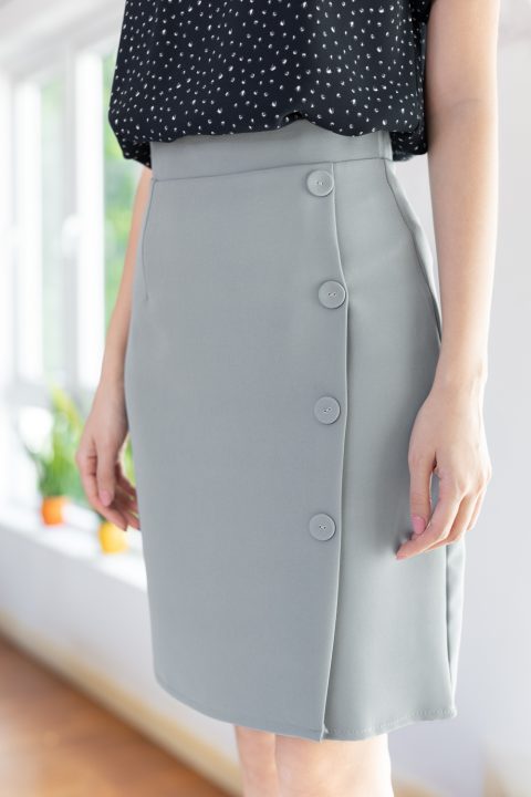 กระโปรงทรงสอบ แบบไม่แคบมาก ผ้าโพลีเอสเตอร์เนื้อดีมาก มีความยืดหยุ่นนิดๆ ด้านหน้าแต่งทรงป้าย ประดับกระดุมปั๊มแบนๆ ผ่าซิปซ่อนด้านหลัง ความยาวกำลังเรียบร้อย มีซับในอย่างดี งานสวยมากค่ะ