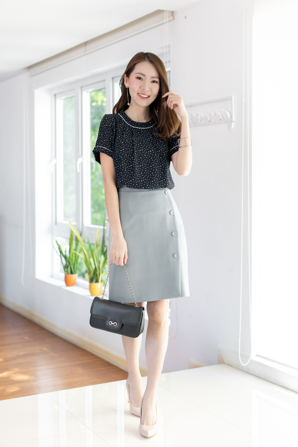 กระโปรงทรงสอบ แบบไม่แคบมาก ผ้าโพลีเอสเตอร์เนื้อดีมาก มีความยืดหยุ่นนิดๆ ด้านหน้าแต่งทรงป้าย ประดับกระดุมปั๊มแบนๆ ผ่าซิปซ่อนด้านหลัง ความยาวกำลังเรียบร้อย มีซับในอย่างดี งานสวยมากค่ะ