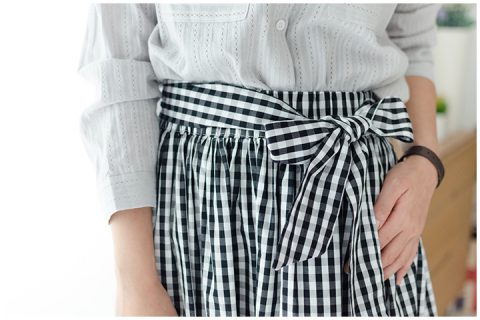 กระโปรงยาว ลายตารางสีดำ ตัดเย็บด้วยผ้าโพลีเอสเตอร์ผสมเนื้อหนา ทรงบานพองาม เอวเป็นสม็อครอบตัว มีสายผูกเป็นโบว์เย็บติดกับขอบด้านหลัง มีกระเป๋าซ่อนด้านข้างด้วย ไม่มีซับใน แต่ไม่บาง สีดำใส่แมตช์ง่ายเลยค่า