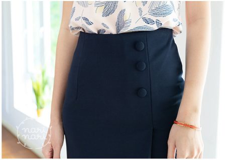 กระโปรงสั้นทรงสอบ แบบไม่แคบมาก ผ้าโพลีเอสเตอร์เนื้อหนา ด้านหน้าแต่งป้ายหลอก ประดับกระดุม 3 เม็ดด้านข้าง ผ่าซิปซ่อนด้านหลัง ไม่มีซับในแต่ไม่บางค่ะ