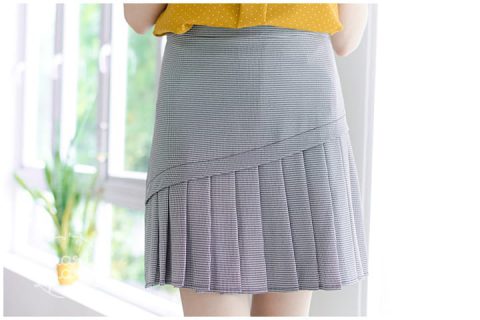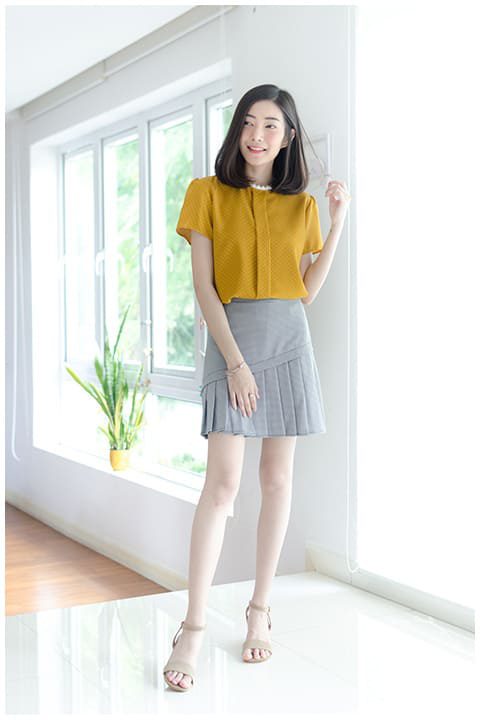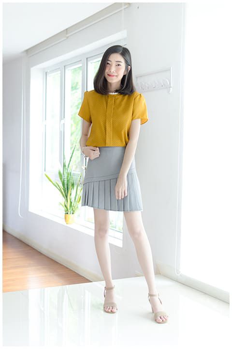 กระโปรงสั้นทรงเอเล็กๆ ตัดต่อชายพลีทแบบเฉียงๆ ด้านหน้า ผ้าโพลีเอสเตอร์ผสม เนื้อนิ่ม ยืดหยุ่นได้เล็กน้อย ลายชิโนริเล็กๆ สีดำ แมตช์ง่าย ผ่าซิปซ่อนด้านหลัง ไม่มีซับในแต่ไม่บางค่ะ