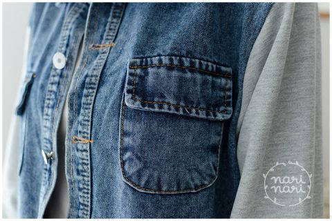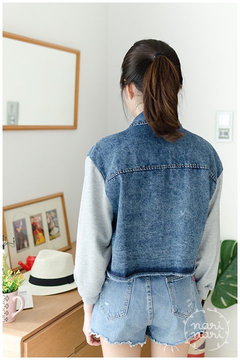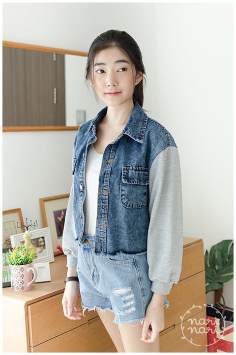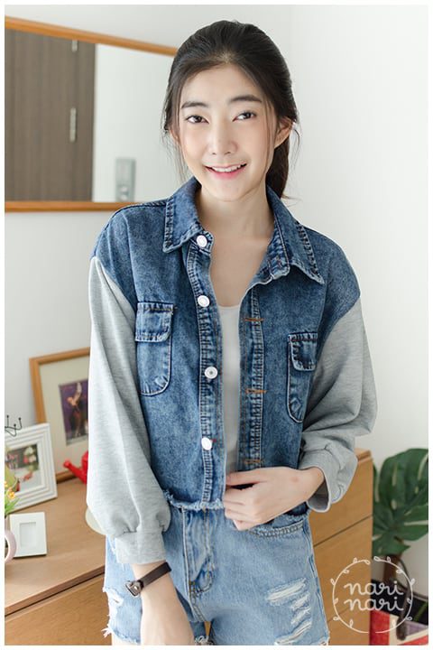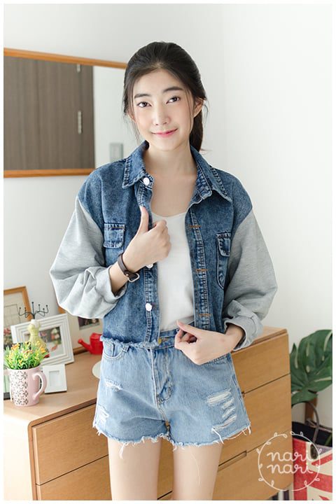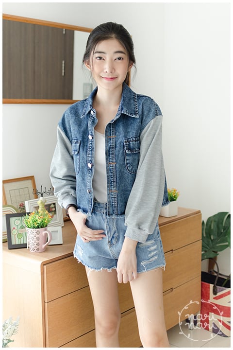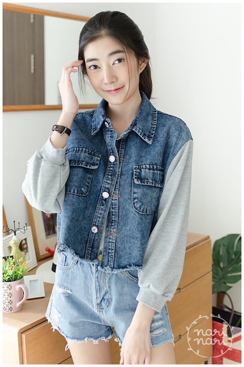 Jacket เสื้อคลุมยีนส์ครอป ตัวสั้น สีเข้มกำลังดี ชายเสื้อแต่งรุ่ยๆ ทรงชายบานเล็กน้อย คอปก มีกระเป๋าจริง เพิ่มความแนวด้วยการต่อแขนด้วยผ้าคอตตอนหนานุ่ม สีเทา ใส่ได้ลุคสตรีท น่ารักได้เรื่อยๆ ค่า