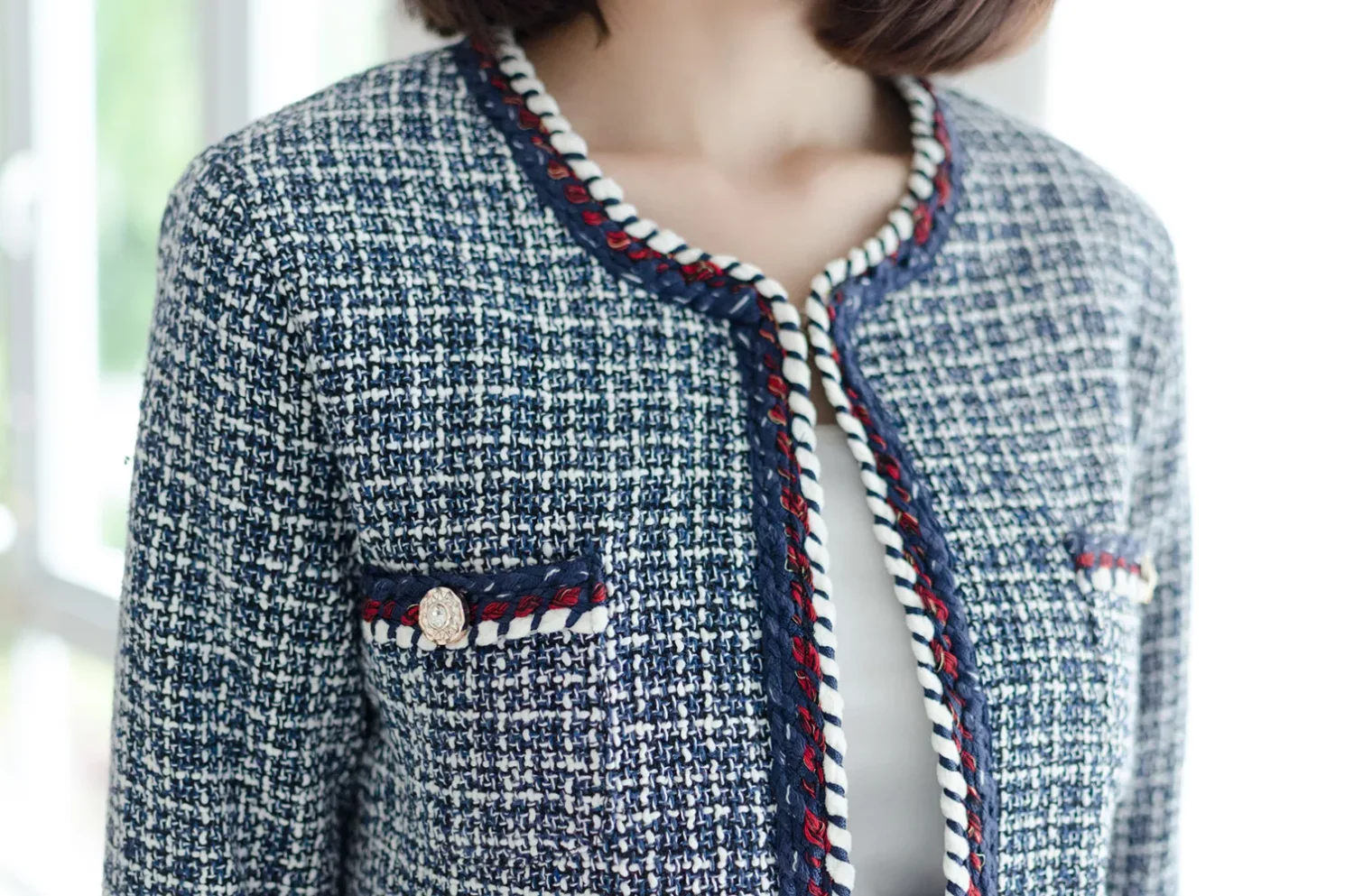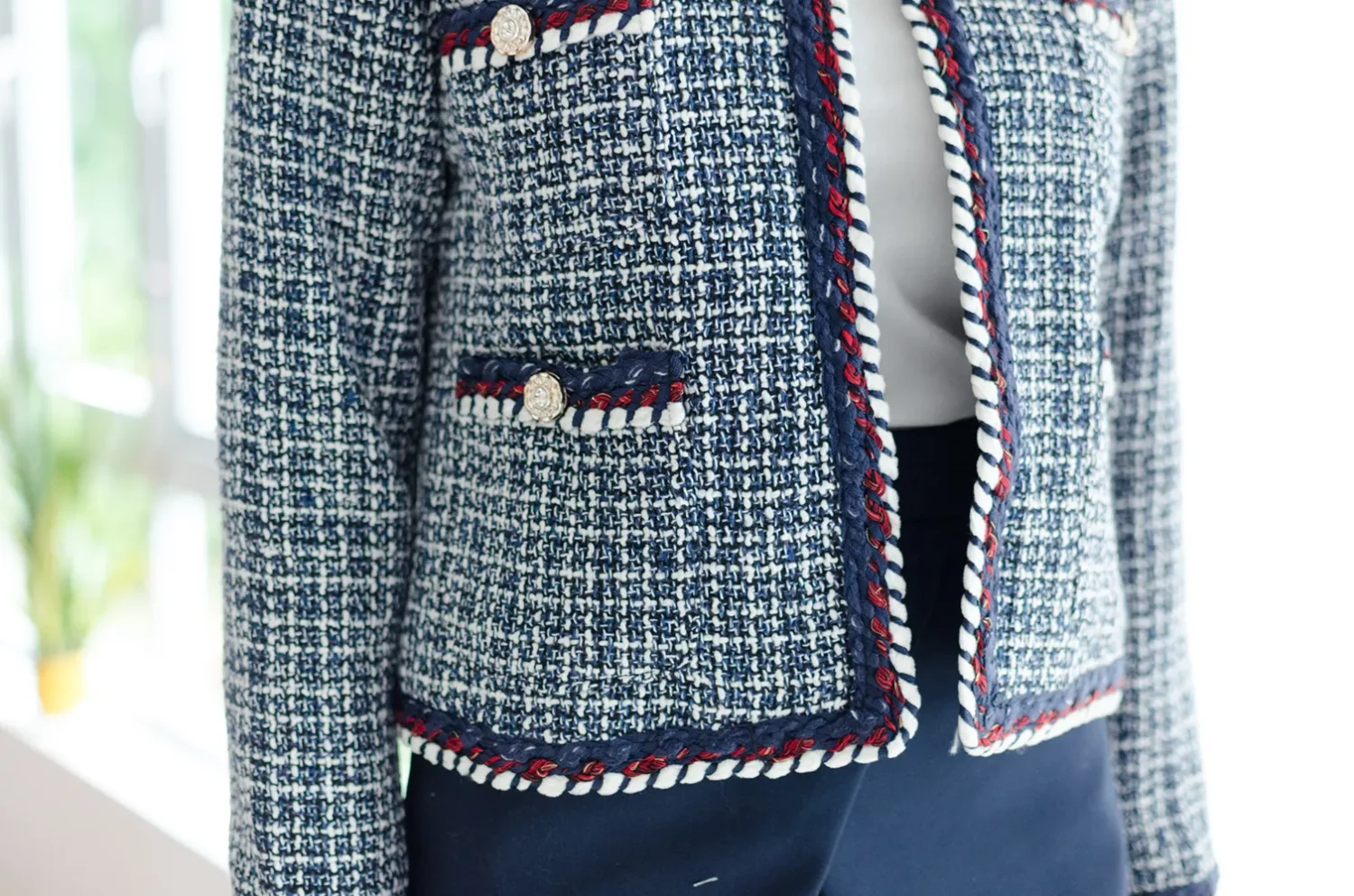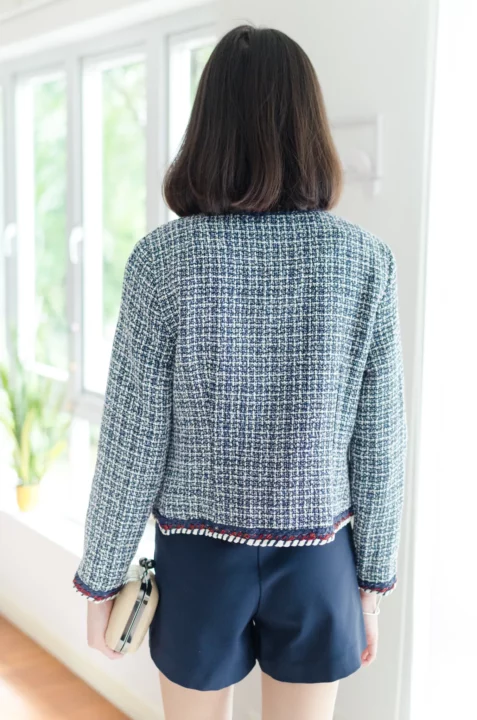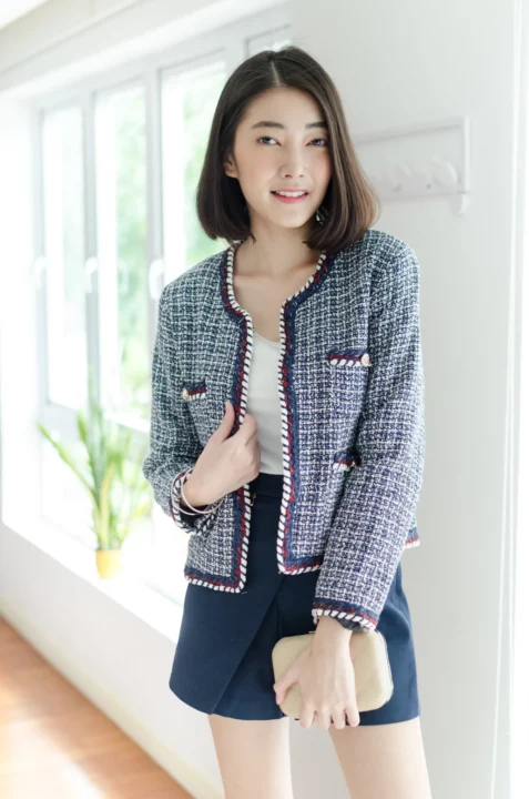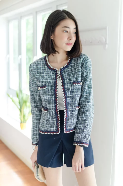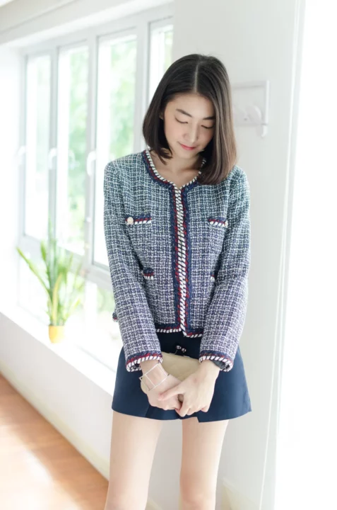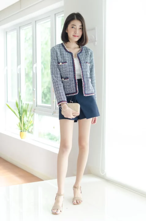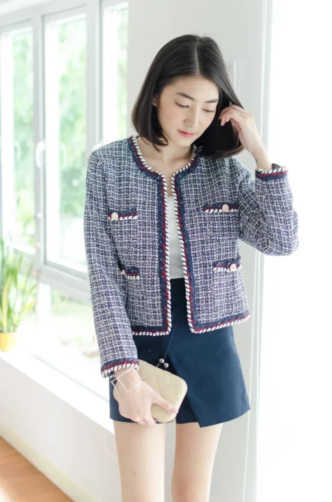 Blazer ผ้าทวีตทอเนื้อแน่น สวยงามเลอค่า สีเข้มสวย แต่งขอบด้วยผ้าสีกรมท่า-แดง-ขาว ดูดีมาก มีกระเป๋าจริงทั้ง 4 จุด ตัวนี้ไม่มีกระดุมนะคะ มีตะขอซ่อนไว้เกี่ยวตรงคอนิดนึง ไว้ใส่คลุมเก๋ๆ รับรองว่าใส่ปุ๊บดูดีขึ้นมาทันทีเลยค่า