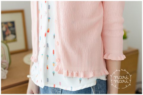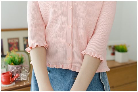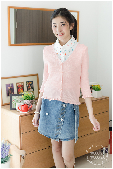 เสื้อคลุมไหมพรมทอลายเปลือกไม้ เนื้อไม่หนา คอวี มีกระดุมหน้า แขนยาวสามส่วน แต่งขอบแขนและชายเสื้อระบายๆ เล็กน้อย ใส่คลุม แมตช์ง่าย จัดมา 3 สีสวย ใส่ง่ายค่า