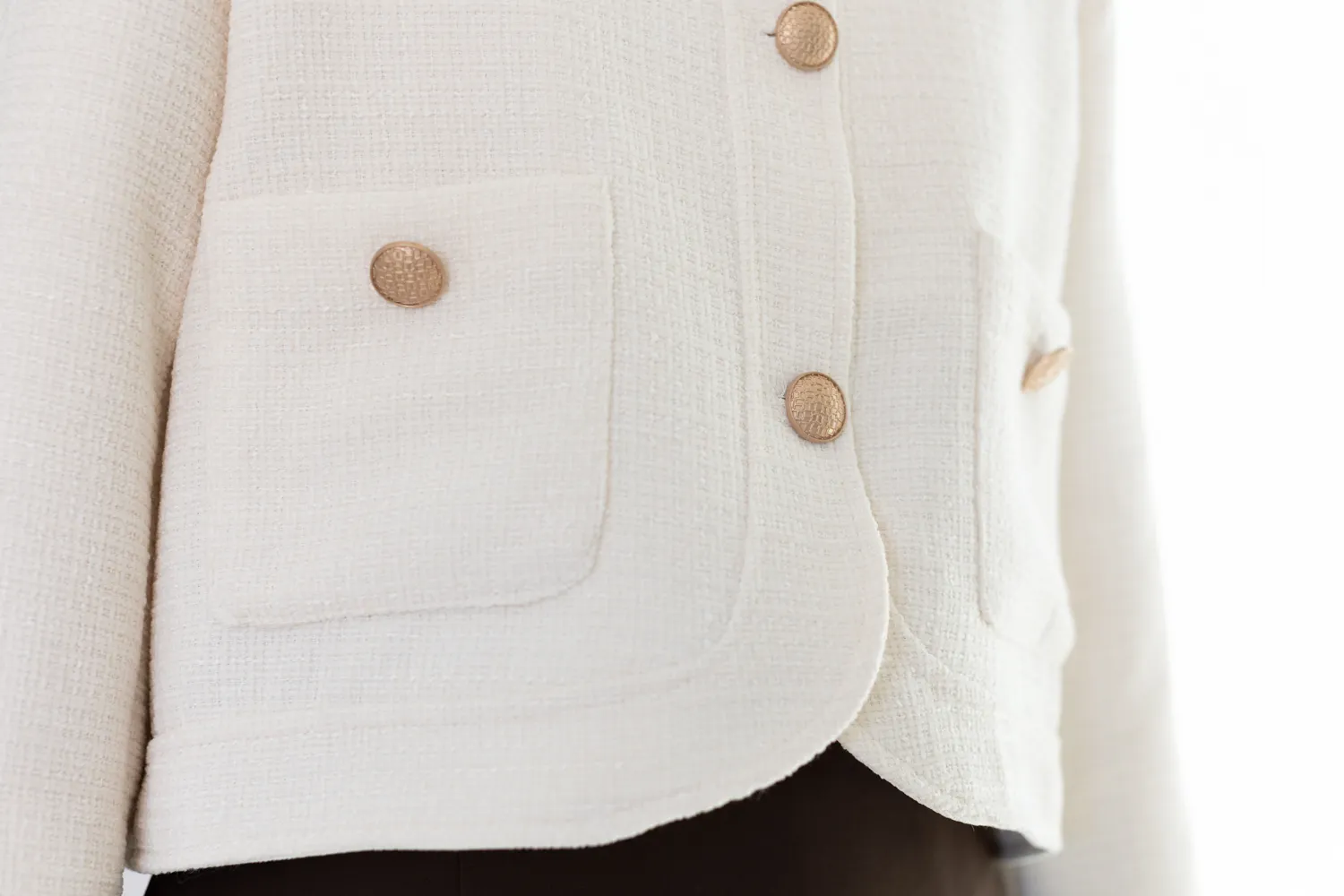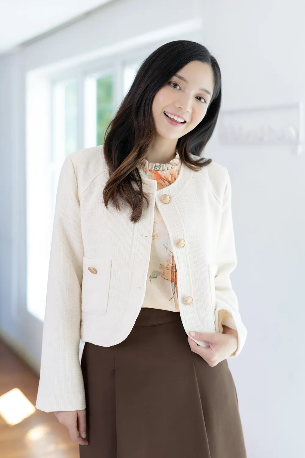 เสื้อคลุมทรงสั้นที่ใช้ผ้า Bouclé เลยน่ารักสุดๆ ผ้านิ่มทอมี Texture แบบตุ่มเล็กๆดูละมุน ไม่แข็ง คอกลม ไม่มีปกคอเสื้อ เล่นตะเข็บโค้งช่วงบ่า ทำให้ดูคลาสสิกกึ่งสบาย ไม่ทางการเกินไป แต่ยังดูเรียบร้อยและเก๋ไปพร้อมๆกัน เสื้อคลุมมาพร้อมซับในเต็มตัวใส่สบาย มีกระเป๋าจริงด้านหน้า