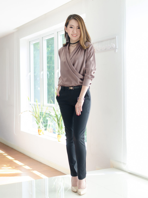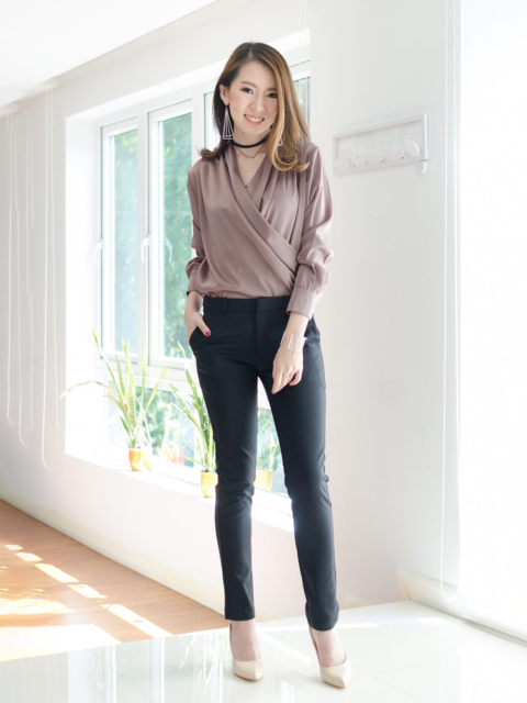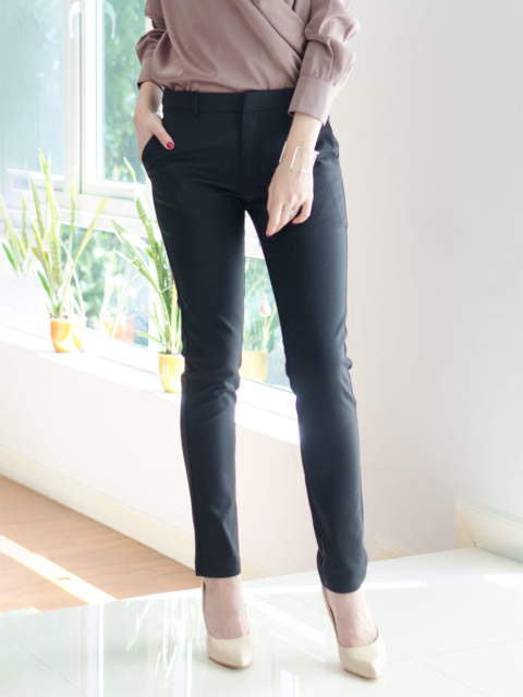 กางเกงขายาว ผ้าเนื้อดีสุดๆ เนื้อหนา ผ้า Polyester ผสม Viscose Elastanne ยืดหยุ่นนิดๆ ด้านหน้ามีกระเป๋าจริง ขอบกระเป๋าแต่งกุ๊นแบบ Piping งานประณีต ด้านหลังแต่งกระเป๋าหลอก เอวกลางๆ ไม่ต่ำมาก ใส่ขึ้นมาจะอยู่ใต้สะดือประมาณ 0.5” ใส่สบายมาก เหมือนใส่เลคกิ้งเลย ทรงสวยค่า