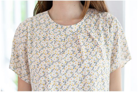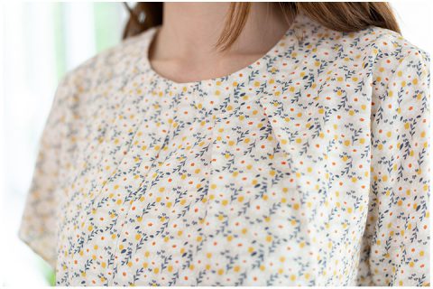 เสื้อแขนสั้น ผ้าโพลีเอสเตอร์เนื้อนิ่มลื่น ลายดอกไม้ คอกลม แต่งขอบคอครึ่งนึง อีกครึ่งนึงตีเกล็ดเป็นจีบรอบๆ คอ ด้านหลังผ่าหยดน้ำ ติดกระดุม ใส่ทำงานเก๋มากมาย