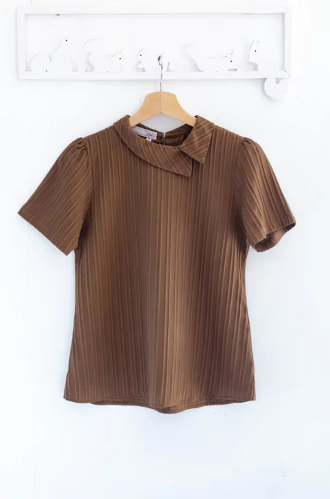 เสื้อดีไซน์คอปกเฉียงๆ แขนสั้น ด้านหลังผ่าหยดน้ำติดกระดุมคอ ใช้ผ้าลาย Texture ริ้วยาวลงมา ไม่หนามากแต่ไม่บางโป๊ ผ้ายืดหยุ่นได้เล็กน้อยตามธรรมชาติของเนื้อผ้าแบบอัดลายค่ะ