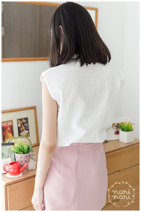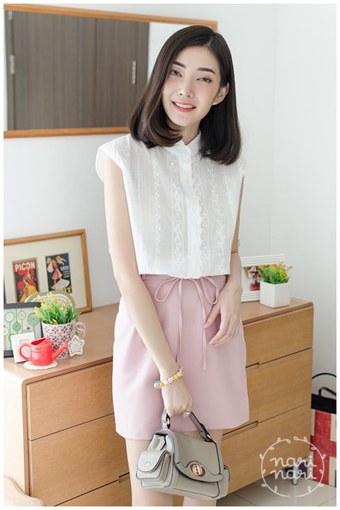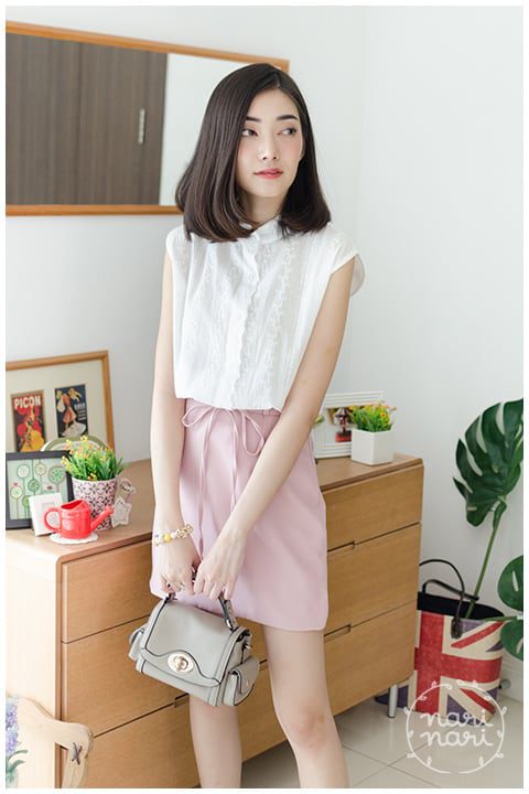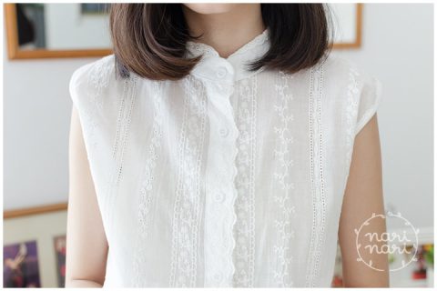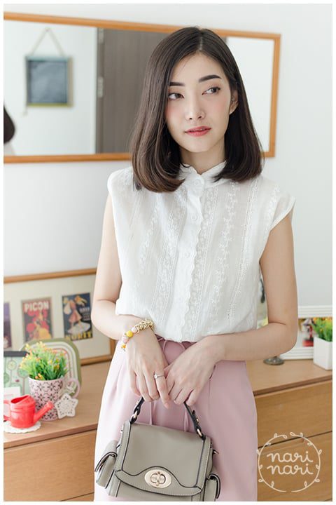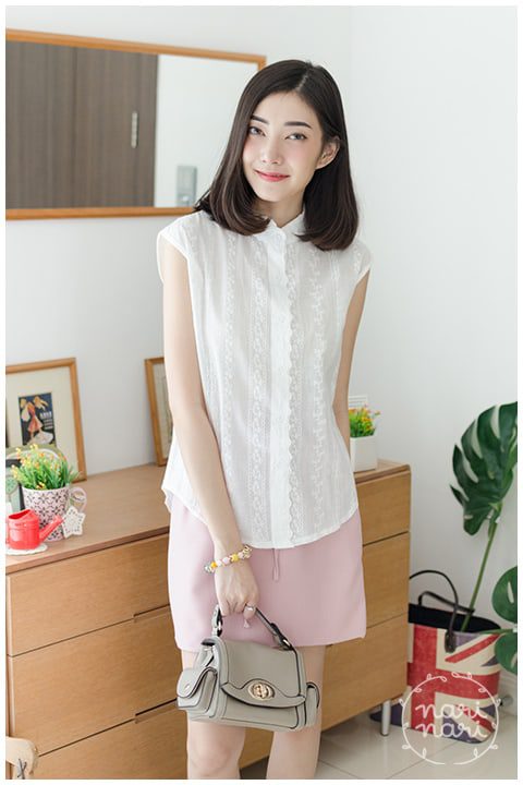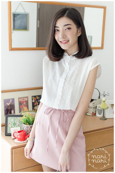 เสื้อเชิ้ตคอตตอนเบาๆ สีขาว ด้านหน้าปักลายดอกเป็นเส้นริ้วๆ หวานๆ คอเป็นทรงคอจีน แต่งลูกไม้เป็นจีบระบายตั้งๆ แมตช์กับขอบสาบเสื้อ สวยงามน่ารัก แขนกุด ใส่สบายไม่ร้อน ค่า
