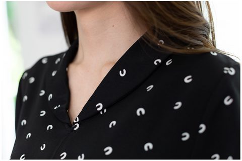 เสื้อทรงสบาย พิมพ์ลายกราฟิกตัวยู แต่งปกบัวเล็กๆ โค้งน่ารัก ตัดต่อคัตติ้งกลางลำตัว แขนสั้น ผ้าโพลีเอสเตอร์เนื้อดี สวยเก๋ค่า
