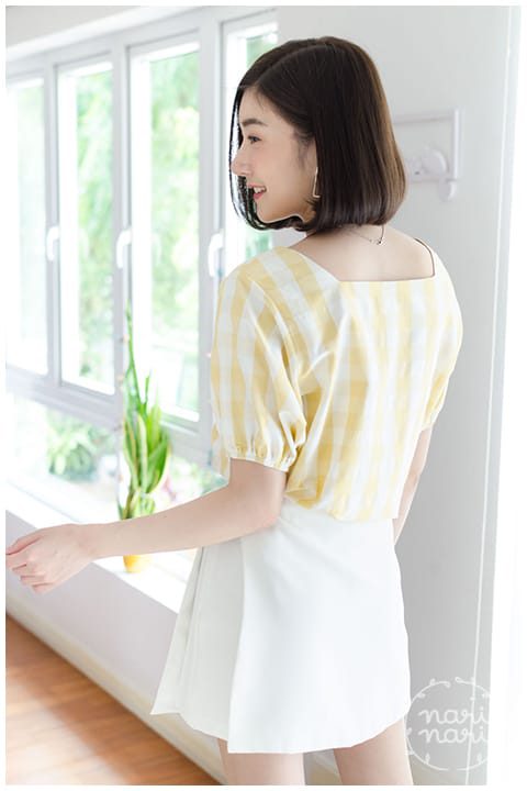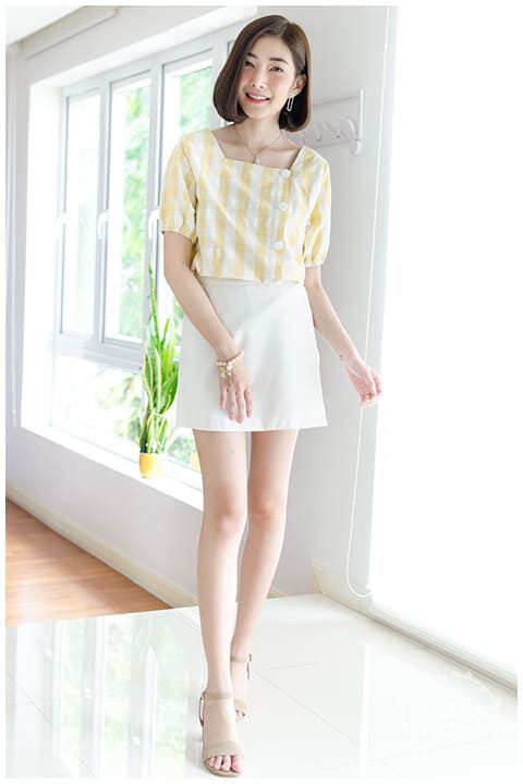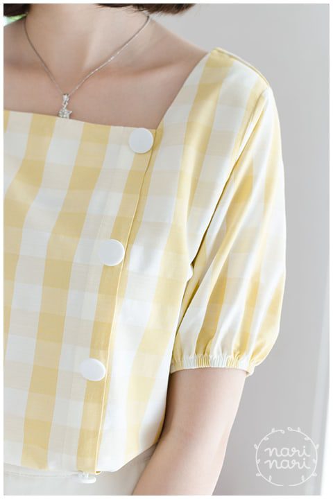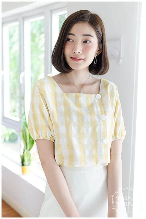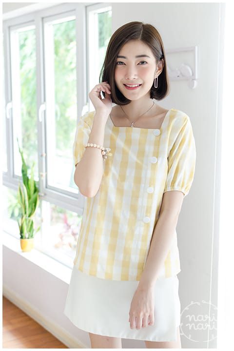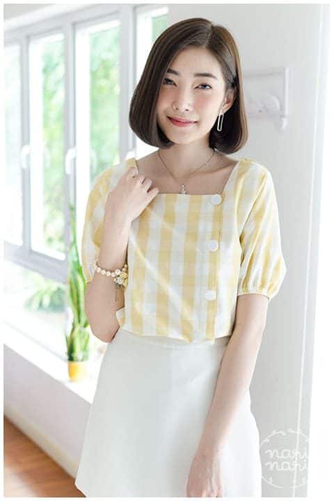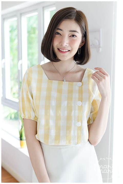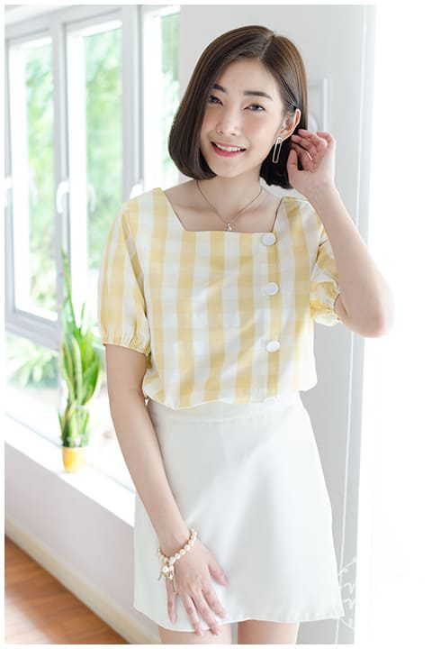 เสื้อน่ารักๆ ผ้าคอตตอนผสมลายตาราง สีพาสเทลหวานๆ ดีไซน์คอเหลี่ยมๆ แต่งกระดุมหลอก เป็นกระดุมขาวแบนๆ เรียงด้านข้าง แขนสั้นทรงตุ๊กตา จัมพ์ยางยืดปลายแขน น่ารักที่สุดเลย ใส่ได้ตลอด น่ารักได้ทุกเมื่อ