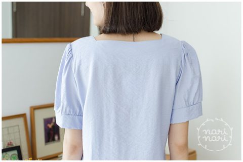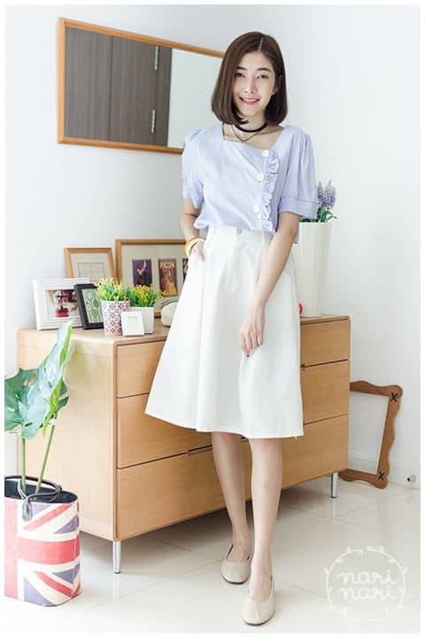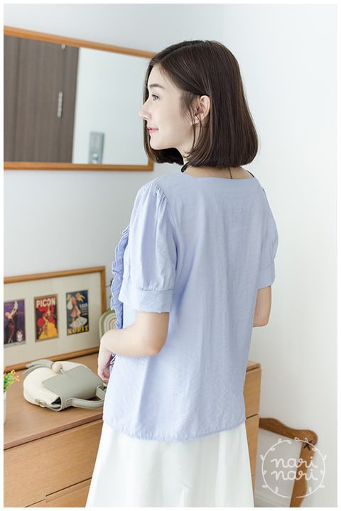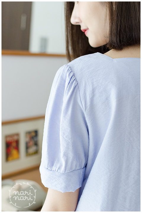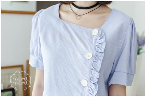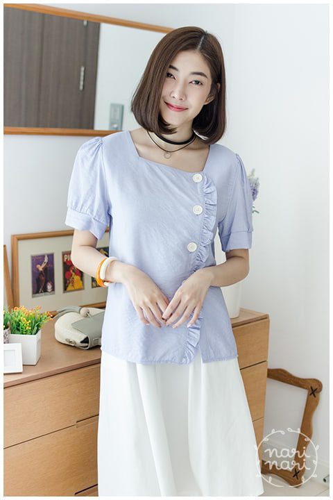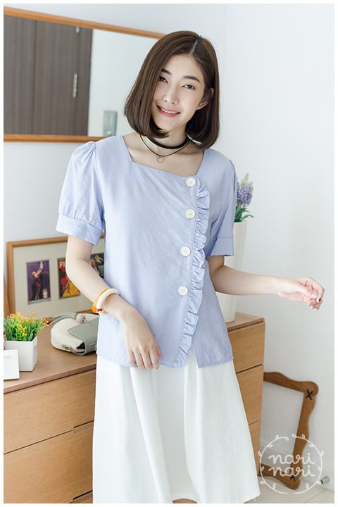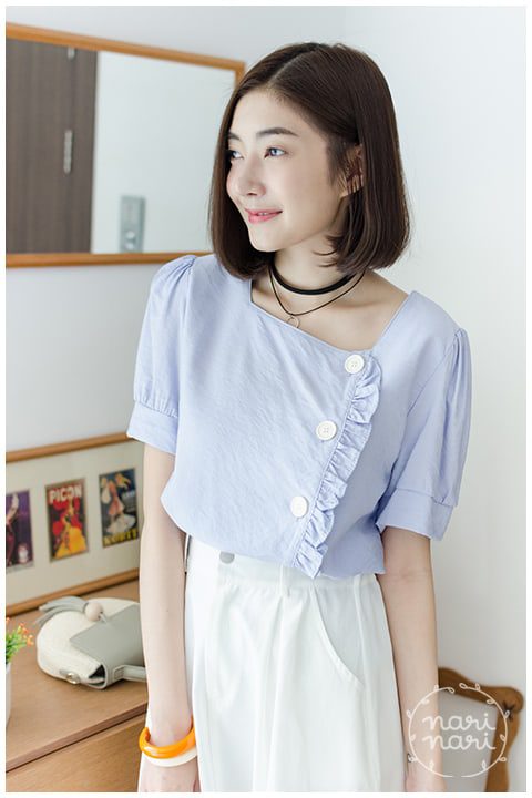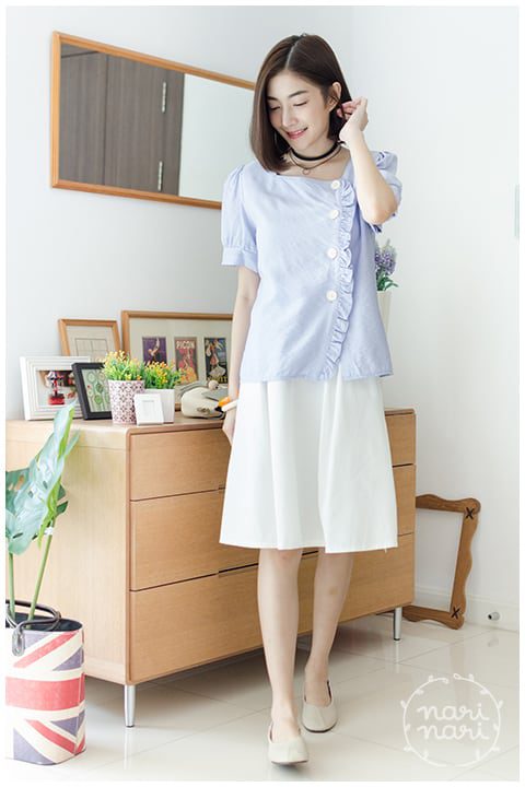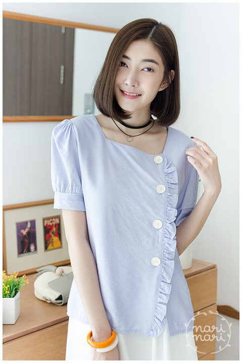 เสื้อคอเหลี่ยม เทนิดๆ ผ่ากระดุมด้านข้าง แต่งจีบระบายหวานๆ ใช้ผ้าสีพื้น ผ้าคอตตอนเนื้อดูย่นๆ ในตัว ดูสบายๆ แมตช์กับอะไรก็สวย แขนสั้นทรงตุ๊กตา จับจีบสวย ดีไซน์เก๋ค่า