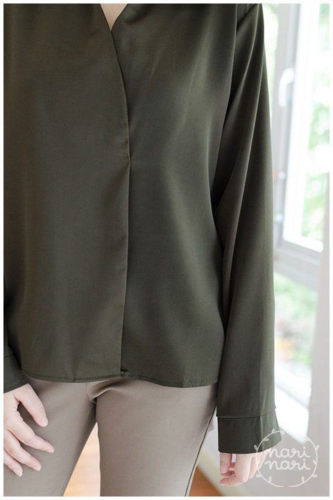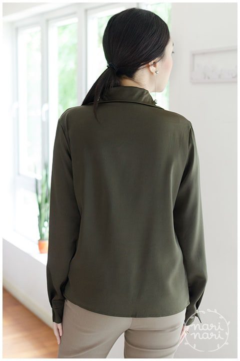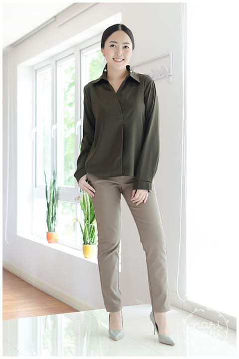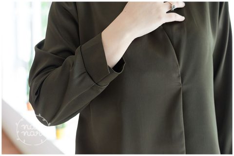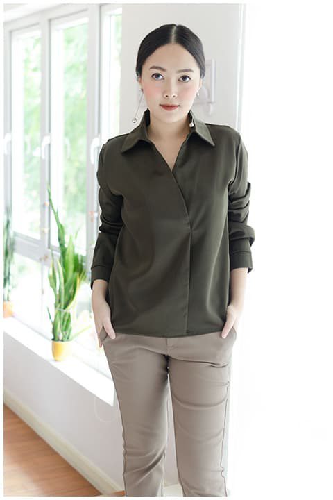 เสื้อแขนยาว คอปก ด้านหน้าซ้อนทับกันเล็กน้อย แต่เย็บติดกันไว้ ไม่เปิด ตัดเย็บด้วยผ้าซาตินพรีเมี่ยม เนื้อหนา สวยมาก เย็นๆ ใส่สบาย แขนยาว แต่งปลายแขนเป็นแฉกเล็กน้อย สีเขียวมะกอกเข้มๆ ขับผิว ใส่แล้วดูดีค่า