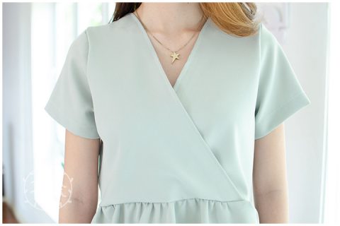 เสื้อแขนสั้นทรงไขว้ซ้อนกันด้านหน้า ซ้อนลึก ไม่เปิด ช่วงเอวต่อจีบรูด ระบายๆ ดูสบายๆ ผ้าโพลีเอสเตอร์ผสม เนื้อดี ยืดหยุ่นได้นิดๆ ใส่สบาย แมตช์กับอะไรก็คูล