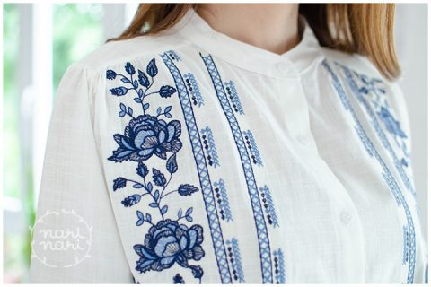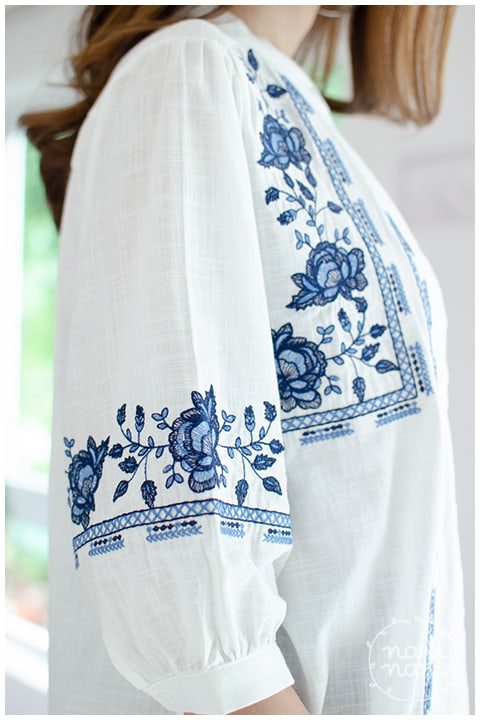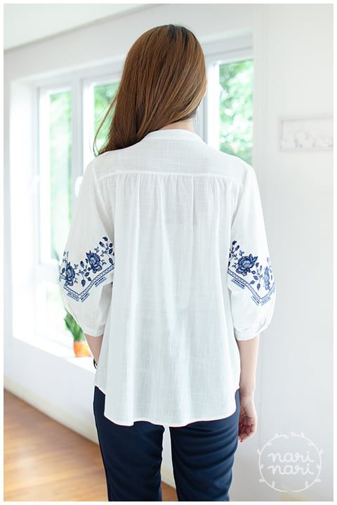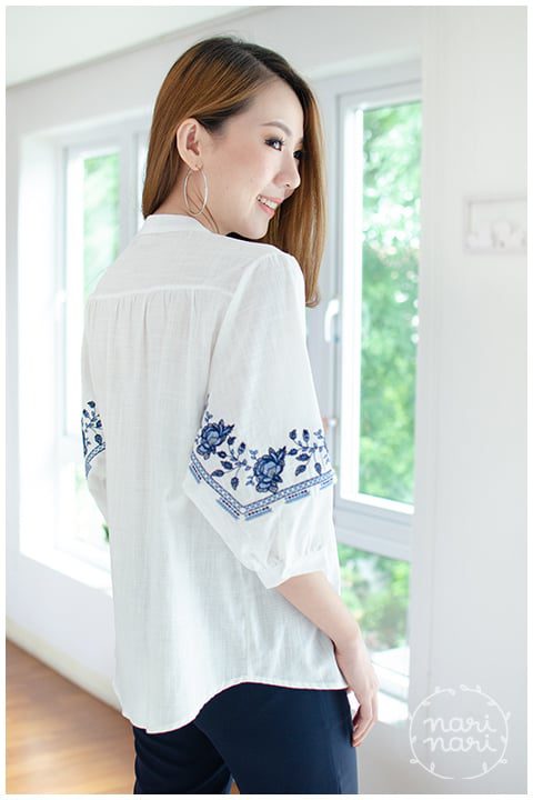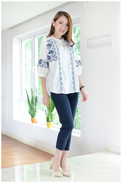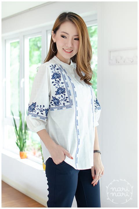 เสื้อคอจีน ผ่ากระดุมด้านหน้า เป็นคอตตอนผสม เดินเส้นลายดอกสีฟ้าและน้ำเงินด้านหน้าและช่วงแขน แขนยาวสามส่วน ปลายแขนพองหน่อยๆ กำลังละมุน ชิลๆ สวยเรียบร้อยค่า