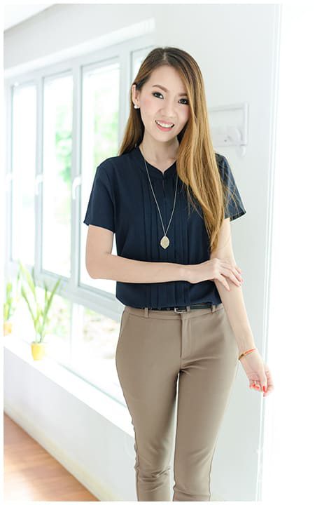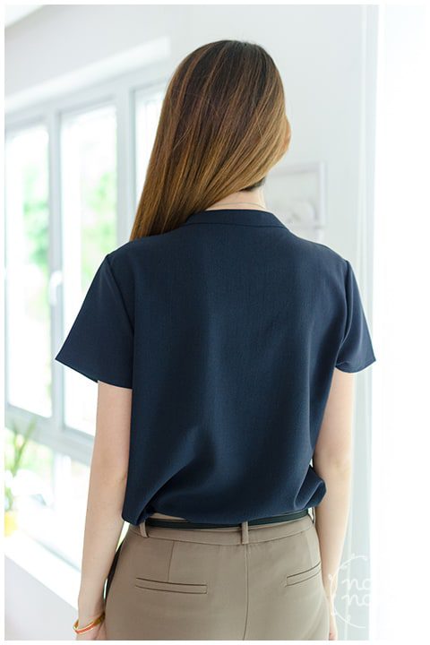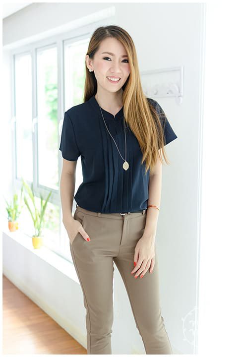 เสื้อแขนสั้น ผ้าโพลีเอสเตอร์ผสม เนื้อดี มีน้ำหนัก สีกรมท่าเข้มๆ ผ่าคอด้านหน้าสั้นๆ มีกระดุมซ่อน ตีเกล็ดด้านหน้าสวยงาม งานดี ใส่ไปทำงานได้ สวยเรียบ ดูดี ใส่ได้นานๆ