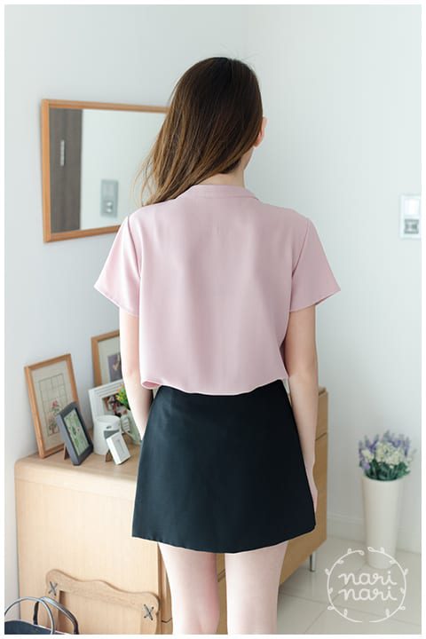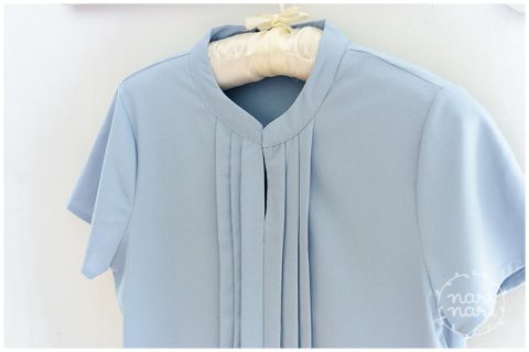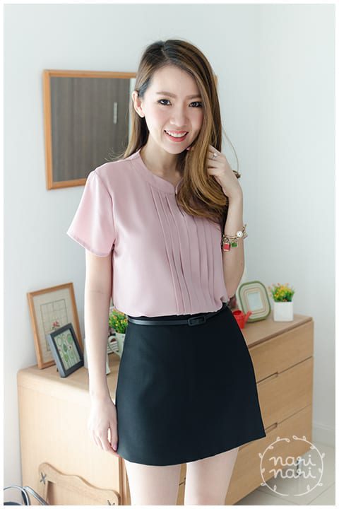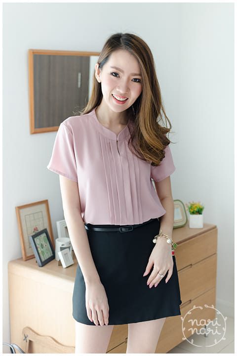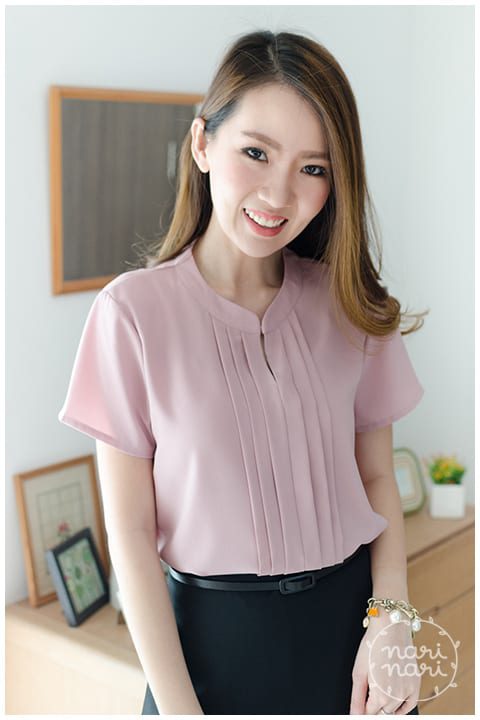 เสื้อแขนสั้น ผ้าโพลีเอสเตอร์ผสม เนื้อดี มีน้ำหนัก สีฟ้าอ่อน ผ่าคอด้านหน้าสั้นๆ มีกระดุมซ่อน ตีเกล็ดด้านหน้าสวยงาม งานดี ใส่ไปทำงานได้ สวยเรียบ ดูดี ใส่ได้นานๆ