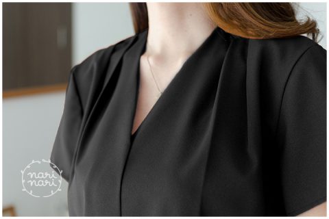 เสื้อคอวี ดีไซน์สวย เป็นคอวีป้ายซ้อนกันนิดๆ ด้านหน้า ไหล่จับจีบเบาๆ แขนสั้น ใช้ผ้าเนื้อดี ดูเรียบร้อย สวยแบบมีคลาสค่า