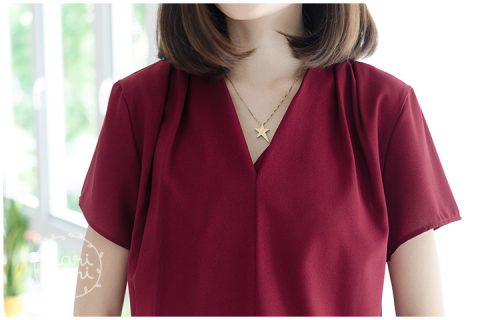 เสื้อคอวี ดีไซน์สวย เป็นคอวีป้ายซ้อนกันนิดๆ ด้านหน้า ไหล่จับจีบเบาๆ แขนสั้น ใช้ผ้าเนื้อดี ดูเรียบร้อย สวยแบบมีคลาสค่า