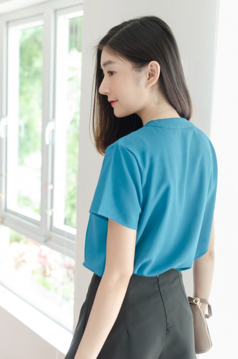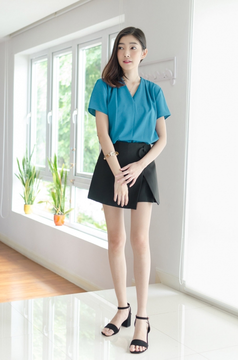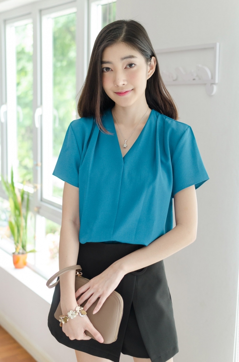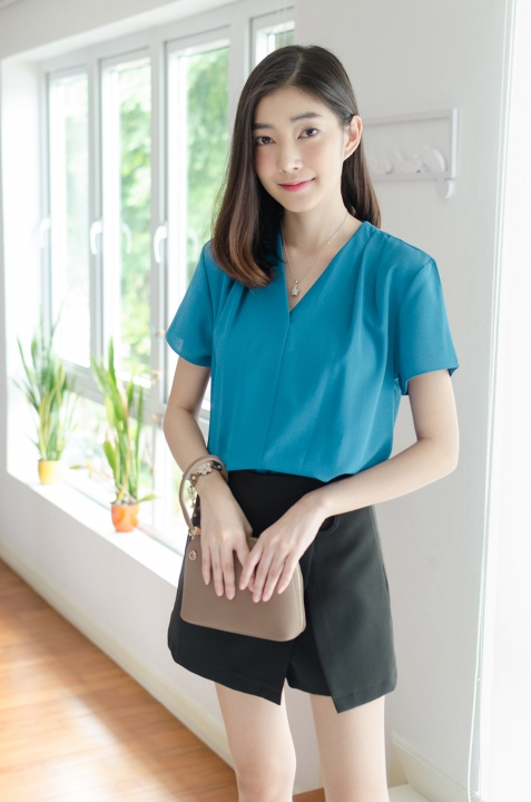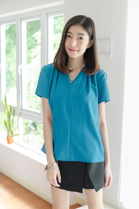 เสื้อคอวี ดีไซน์สวย เป็นคอวีป้ายซ้อนกันนิดๆ ด้านหน้า ไหล่จับจีบเบาๆ แขนสั้น ใช้ผ้าเนื้อดี ดูเรียบร้อย สวยแบบมีคลาสค่า